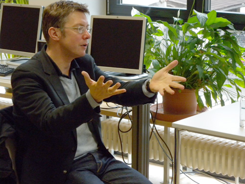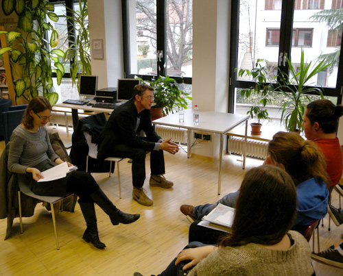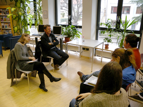 Autor Björn Bicker und Elisabeth Thaler, Dramaturgin der VBB, trafen sich am 05. April 2013 mit Schülerinnen und Schülern des Humanistischen und des Pädagogischen Gymnasiums im Rahmen des Projektes „Theater heute“.