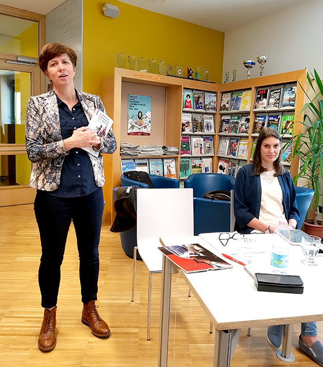 Besonders spannend für die Schülerinnen und Schüler ist dabei die Tatsache, dass Pfanzelter für das Cover ihres Buches ein Foto aus dem Kalenderprojekt des Vorjahres „In den Kleidern der anderen“ unter der Leitung von Elisabeth Hölzl verwendet hat. Pfanzelter lobt die Gymnasien Meran für ihr Interesse an gesellschaftsrelevanten aktuellen Themen und für die Offenheit und Kreativität der Schülerinnen und Schüler im Umgang mit der neuen Migration. Bedeutend ist für Pfanzelter v.a. die Thematisierung des Phänomens und das sei besonders mit dem Kalenderprojekt des Kunstgymnasiums gelungen, das Bilder von jungen Südtirolerinnen und Migranten in der Tracht des jeweils anderen gezeigt hatte und medial sehr kontrovers diskutiert worden war. Ebenso kontrovers werde auch das Cover des Buches in Wissenschaftskreisen aufgenommen und das zeuge von der emotionalen Aussagekraft der Arbeiten.
