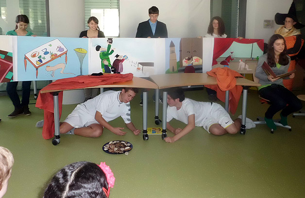 Die Bibliotheken der beiden Schulen und ein Klassenraum wurden zu atmosphärischen Orten gestaltet, in denen Capuccetto Rosso, der Vampir Picadir, unterschiedliche Tiere des Urwaldes, Karlchen, Franz, Milli, Pippi Langstrumpf, die Olchis, die Valerie, Il Principe e il Pollo, Max und Moritz und andere auftraten.