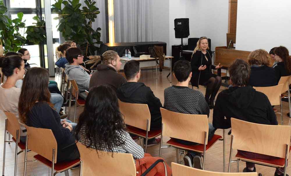 Edith Haller stellte sich nach der Pause einem Interview der Schülerzeitung für deren Rubrik „Charakterköpfe“. Anschließend holte sie für die Abschlussklasse mit Schwerpunkt Musik noch einmal weit aus und gab Einblick in die Welt der Bayreuther Festspiele und Richard Wagners. Dabei stellte sie eingangs klar, dass sie sich von seiner antisemitischen Vergangenheit distanziere und sich ausschließlich mit seiner Musik beschäftige. Gespannt lauschte das Publikum den Erzählungen der Wagnerdarstellerin zum Inhalt von „Der Ring des Nibelungen“
