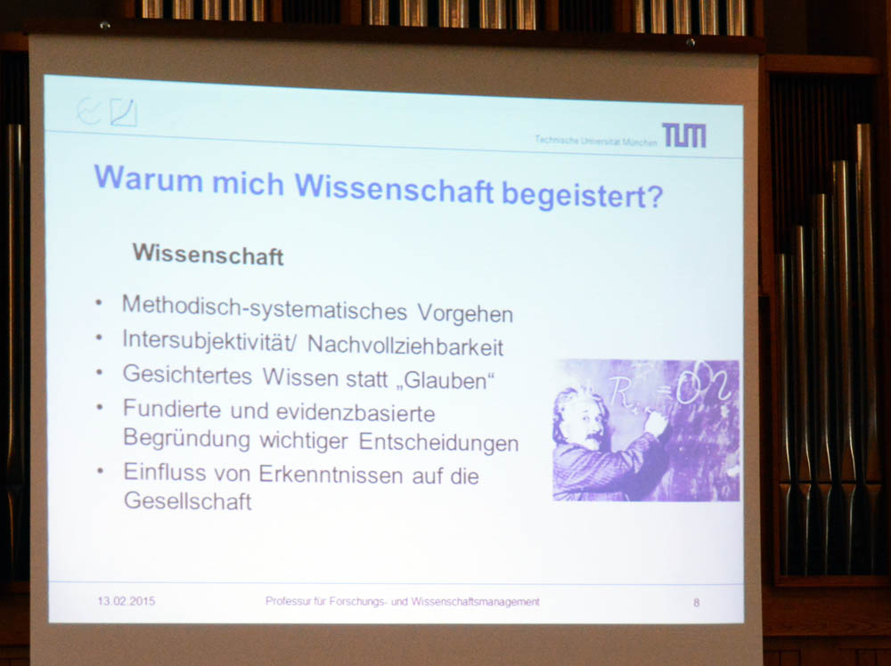 Armin Pircher Verdorfer gab Einblick in die „Anforderungen im Bereich Wissenschaft und Forschung am Beispiel der Lehr- und Forschungstätigkeit an der TU München". Dort forscht und lehrt er zum Bereich „Führungskräfte und ihre Entwicklung“. Die Tum pflegt eine enge Zusammenarbeit mit Betrieben und Institutionen. Es werden Seminare für Mitarbeiter in Führungspositionen angeboten. Die Polizei z.B. bildet ihre Führungskräfte an der Technischen Universität aus, Zusammenarbeit besteht auch mit Konzernen wie BMW und Siemens. Erkenntnisse, die diese Professur in ihrer Forschung generiert, werden direkt an Entscheidungsträger in der Wirtschaft weiter gegeben. Die Publikationen zu den Ergebnissen sind fast ausschließlich in englischer Sprache gehalten.
