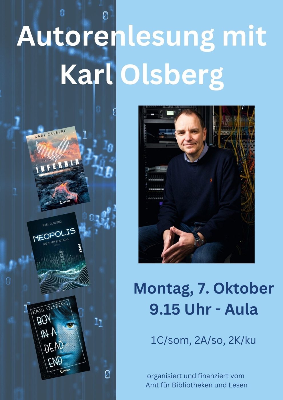 Am Montag, 07. Oktober war Herr Karl Olsberg an unserer Schule zu Gast und hat aus seinem Buch „Infernia“ gelesen, das im Jahr 2023 im Loewe-Verlag erschienen ist. Drei Klassen (1C/som, 2A/so und 2K/ku) waren zur Lesung in der Aula eingeladen.