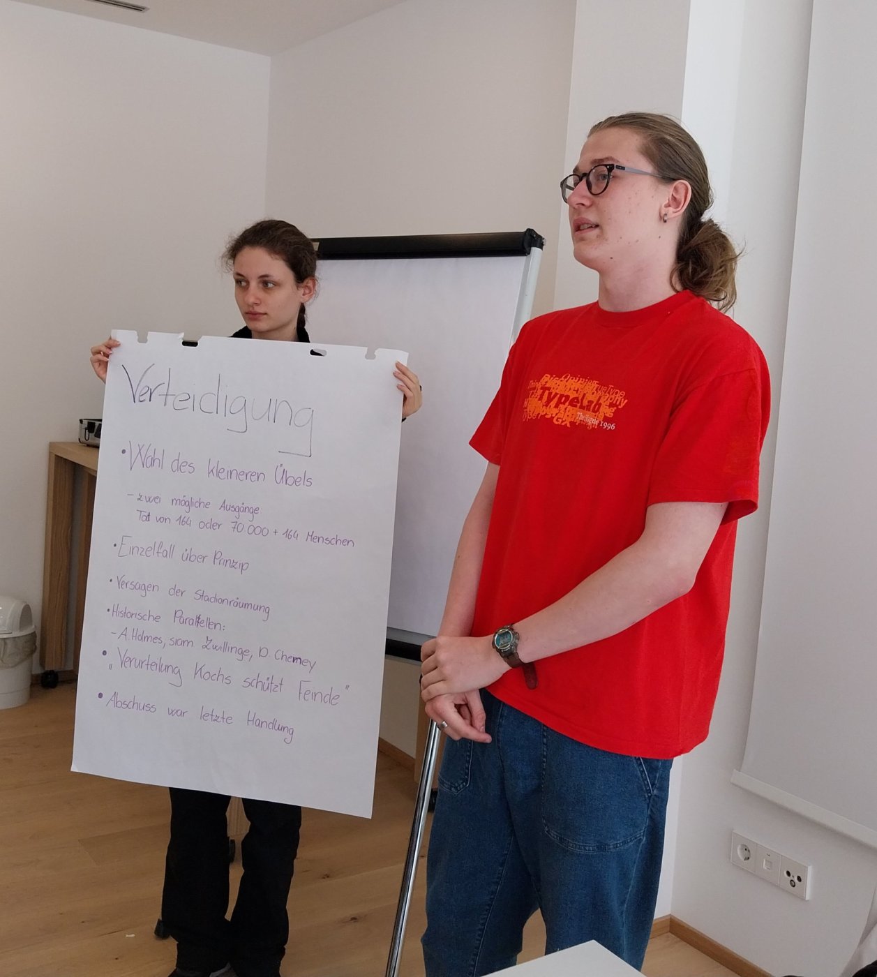 Ausgehend von literarischen und philosophischen Problemstellungen untersuchten die Schüler*innen des Klassischen Gymnasiums Meran strittige Fälle, lieferten sich bisweilen hitzige Diskussionen, zwischen Zustimmung und Ablehnung schwankend, und versuchten auch ihre Entscheidungen zu hinterfragen und/oder zu differenzieren.