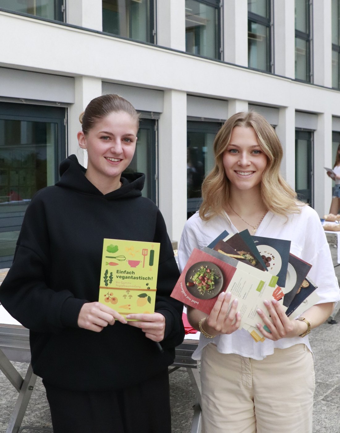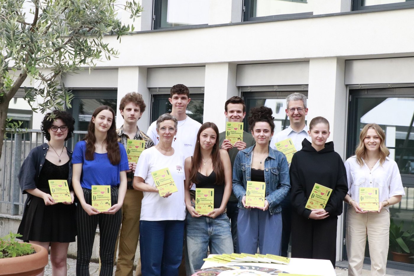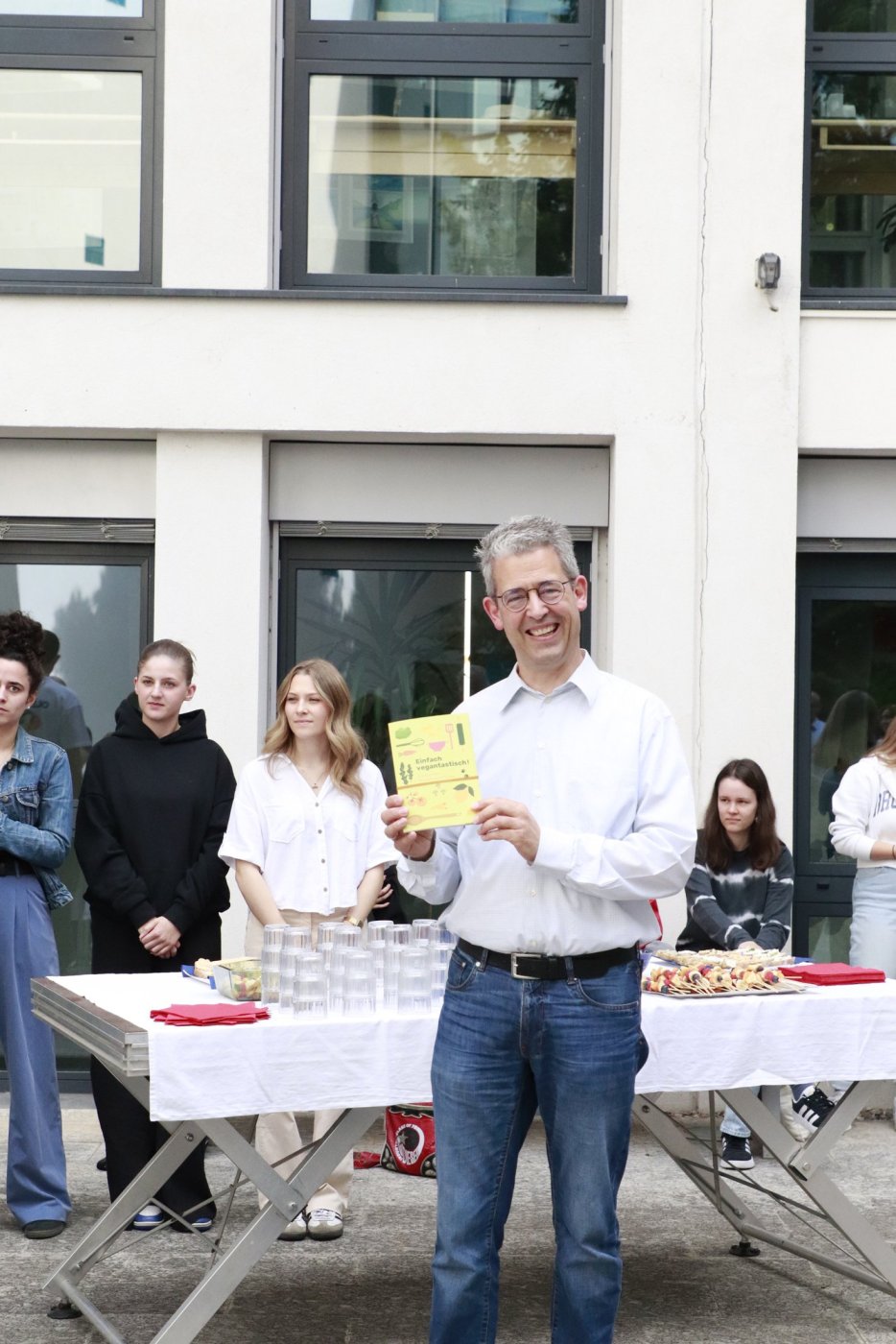 Um das zu ändern haben wir über ein ganzes Schuljahr lang Rezepte gesammelt, fotografiert und getextet, was das Zeug hielt. Das Ergebnis durften wir am 11. Juni im Schulhof des Gymme vor mehreren Klassen präsentieren. Nach einer Vorstellung des veganen Kochbuches gab es dann ein reichhaltiges, vollkommen veganes Büffet.