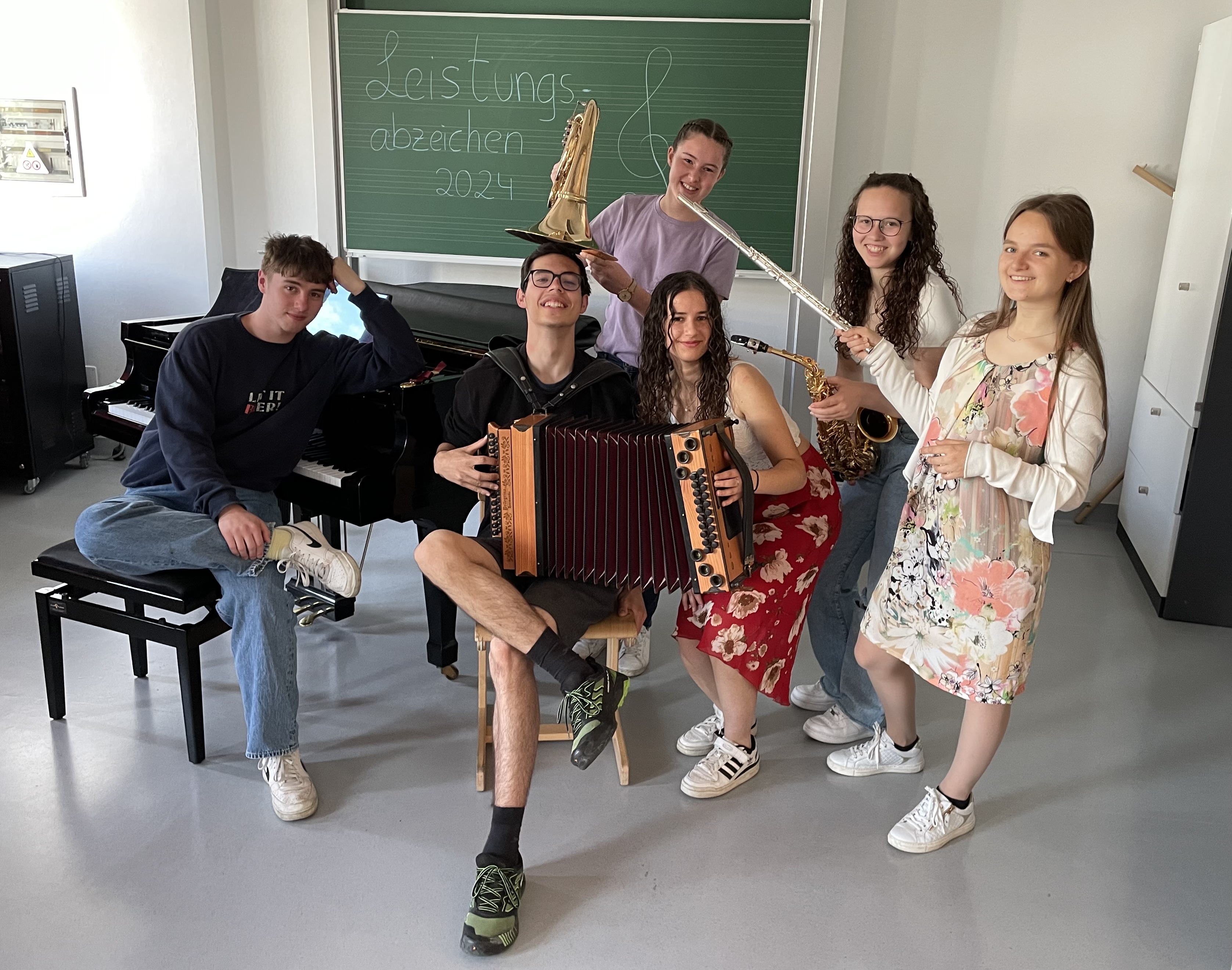 Gleich sechs Schülerinnen und Schüler haben in den letzten Schultagen mit Bravour das Leistungsabzeichen in Gold absolviert. Es sind dies aus der 3C/som: Loredana Popa, Klavier mit sehr gutem Erfolg, die beiden Saxophonistinnen Vera Schwienbacher mit sehr gutem Erfolg und Hannah Spechtenhauser mit ausgezeichnetem Erfolg. Von der 5C/som: Marlen Schwarz, Querflöte mit gutem Erfolg, Thomas Prünster, Harmonika mit ausgezeichnetem Erfolg, sowie Franziska Hofer aus der 4B/so, Horn mit ausgezeichnetem Erfolg.