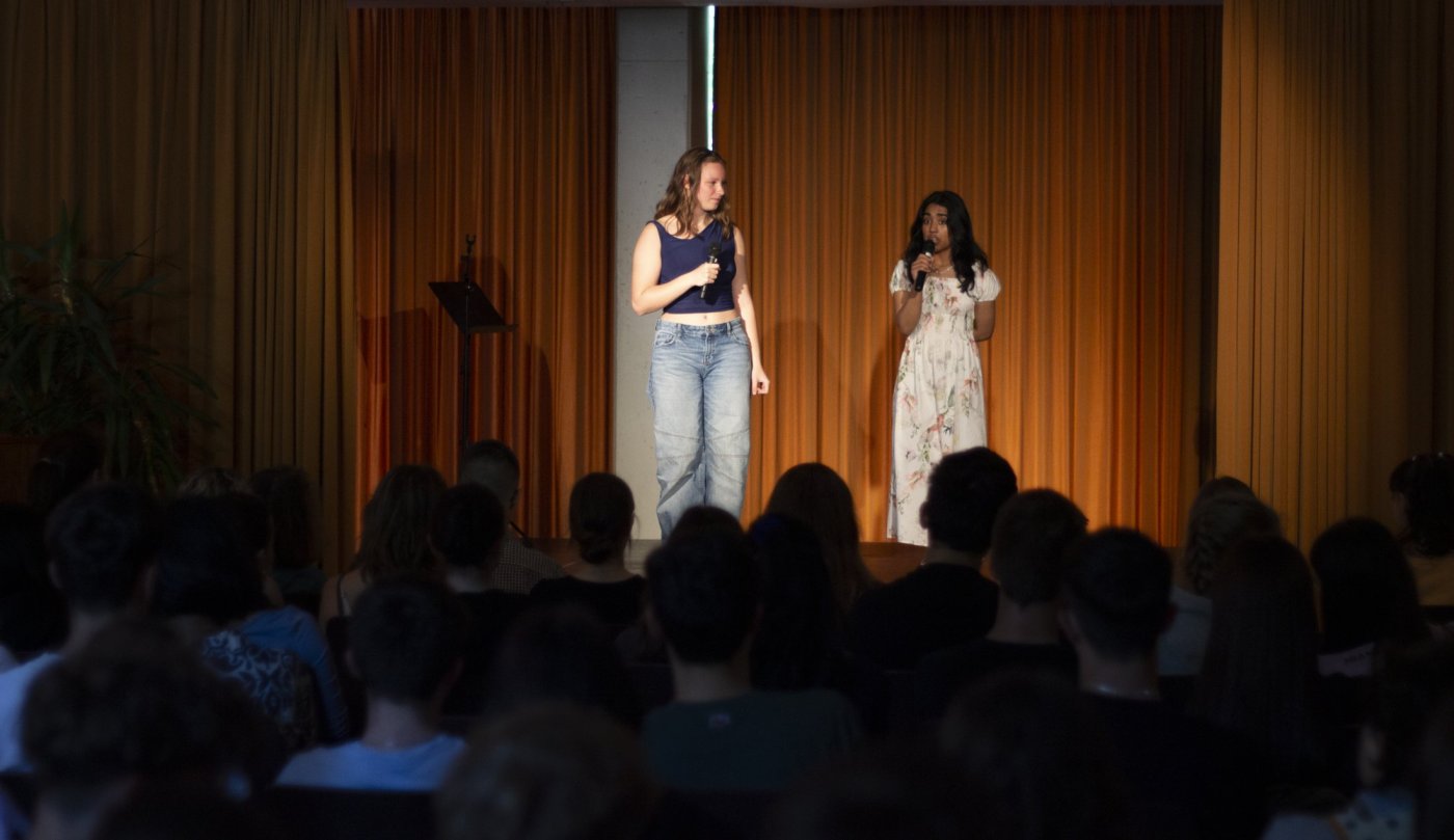 Schon seit Jänner bereiteten sich 13 Schüler*innen aus verschiedenen Schultypen und Schwerpunkten unserer Schule auf ihren Auftritt vor. Am 5. und 6. Juni war es dann so weit: Die „Bühne der Tatsachen“ stellte sich dem Publikum. Knapp 20 Klassen besuchten die Aufführungen, auch die Abendvorstellung war gut besucht.