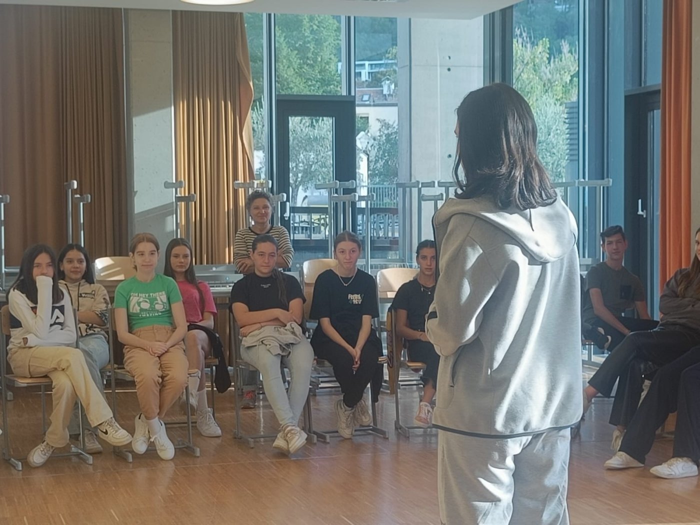 In diesem Schuljahr hat die AG KRT (Kommunikation-Rhetorik-Theater) eine neue Initiative gestartet, um den Schülerinnen und Schülern der ersten Klassen das gegenseitige Kennenlernen zu erleichtern und ihnen einen Vorgeschmack auf den Schwerpunkt des Klassischen – und Sprachengymnasiums zu geben. Mit Hilfe der Theaterpädagogin Sabine Ladurner entwickeln die Schüler*innen ein erstes Gespür für Auftreten, Blickkontakt, Stimmintensität und Körperwahrnehmung. Die abwechslungsreichen Übungen, die die erfahrene Schauspielerin spielerisch einstreut, schaffen nicht nur ein Bewusstsein für die eigenen Möglichkeiten, sondern machen auch noch Spaß, wie die Schüler*innen übereinstimmend bekennen.