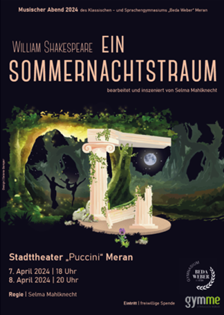 Der traditionelle Musische Abend, die Vorführung eines klassischen Theaterstückes durch die Theatergruppe, bildet den Auftakt zum Jubiläumsjahr der Schulgründung. Auch der Musische Abend feiert ein rundes Jubiläum: 40 Jahre und zum 10. Mal liegt die Regie in den bewährten Händen von Selma Mahlknecht, die mit viel Ausdauer und Geduld einen englischen Klassiker einstudiert hat: William Shakespeares „Ein Sommernachtstraum“.