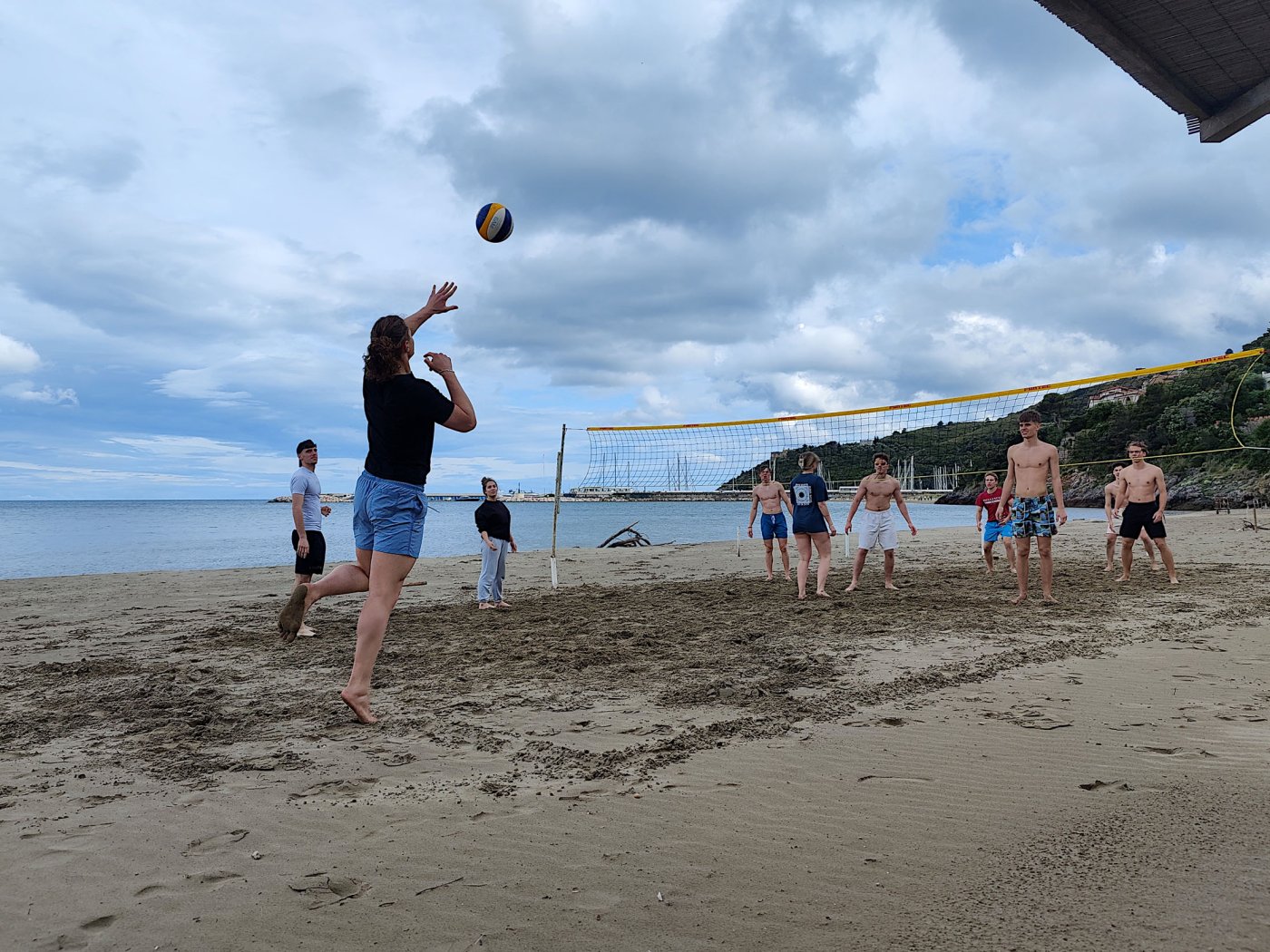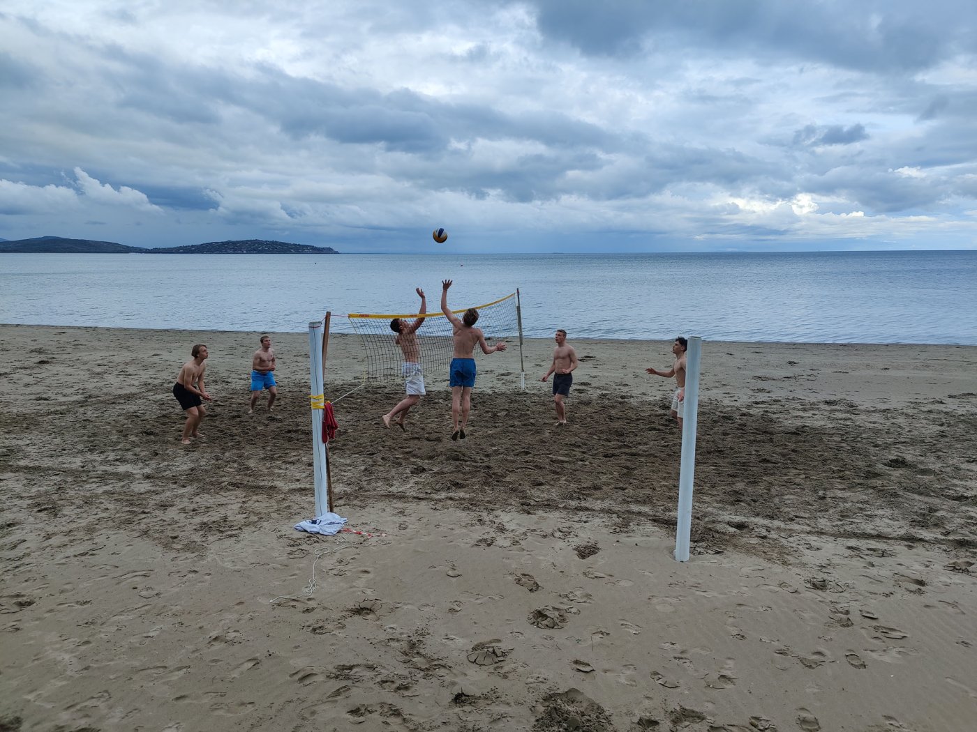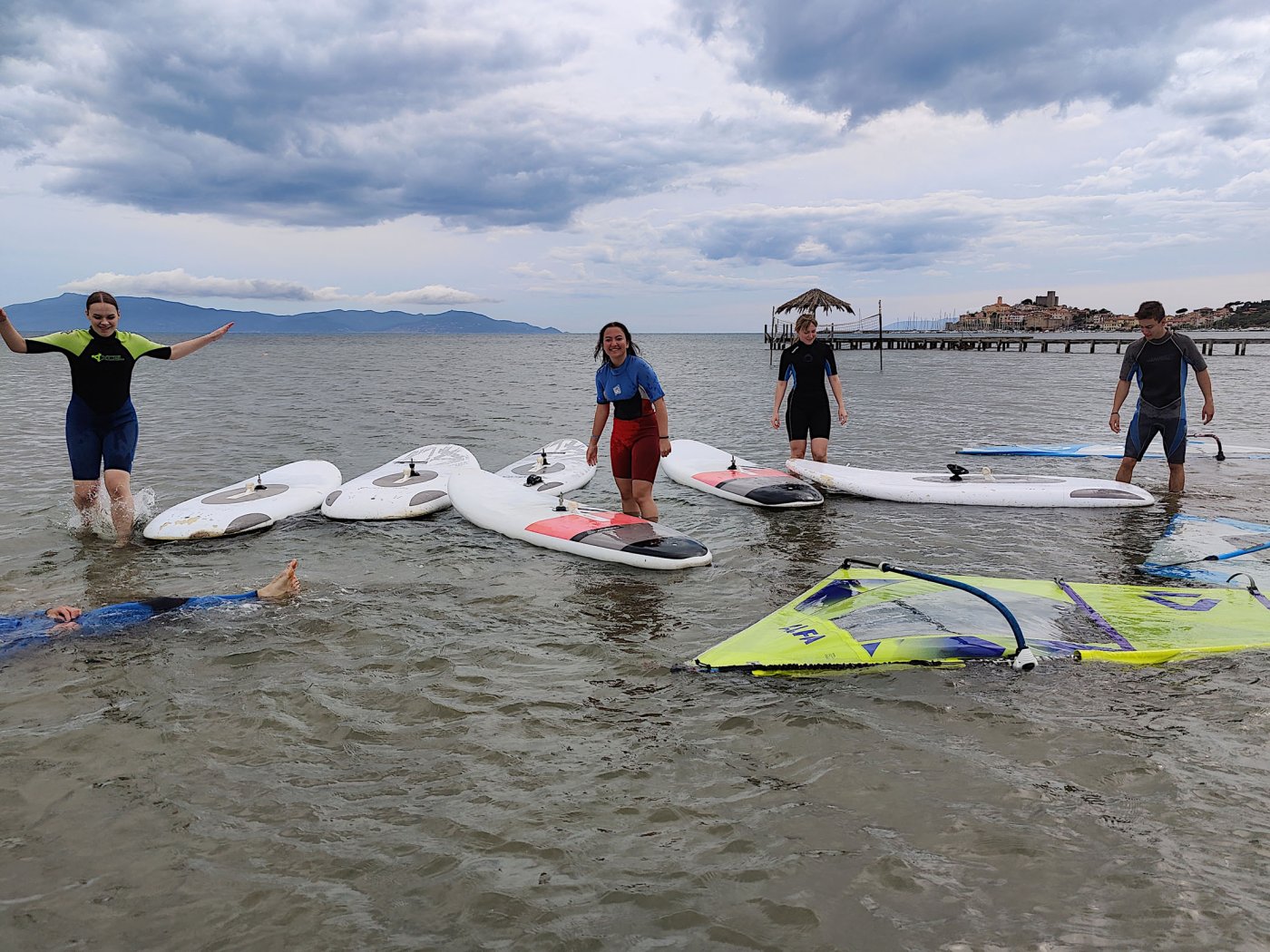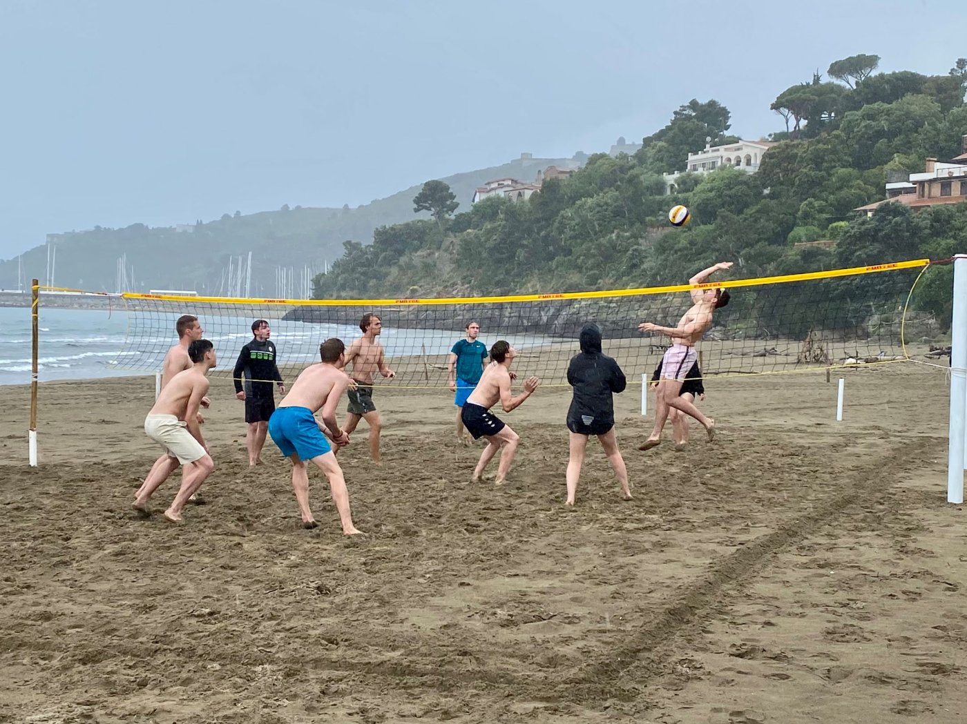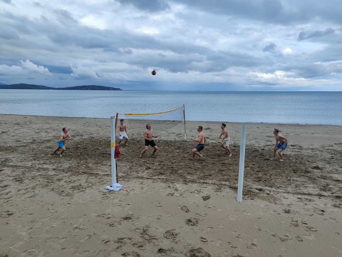 An den Nachmittagen gingen wir dem Sport nach. Auf dem Programm standen zahlreiche Aktivitäten, darunter ein Windsurf- und Kitekurs. Welche der beiden Sportarten man erlernen wollte, entschied jeder selbst. Leider fiel eine der drei geplanten Surfeinheiten ins Wasser. Wir nutzten die uns zur Verfügung stehende Zeit aber bestmöglich aus. Nach einer sehr genauen und ausführlichen Theorieeinheit fanden sich die Windsurfer bereits am Montag im Wasser wieder. Mit dem Wind zwischen den Schultern versuchten wir dort so manchen Meter zu bewältigen, was uns auch schneller als gedacht gelang. Schon bald beherrschten wir unser Surfbrett ausreichend und glitten über das Meer. Die Kitesurfer litten sehr unter den widrigen Wetterbedingungen. Der Wind war schlecht, und so begnügten sich die topmotivierten Kiteschüler mit dem Stand-Up Paddle. Am 2. Tag waen die Windverhältnisse besser, und die Schirme stiegen endlich in den Himmel. Trotz Regen fanden wir sehr lange Spaß an den uns fremden Sportarten im Meer. Am regnerischen Dienstag besuchten wir den “Porto Ercole”. Bevor wir am Strand Beachvolleyball spielten und die Harten unter uns schwimmen gingen, wanderten wir zur “Rocca spagnola”, einer Burg auf einer Anhöhe des Monte Argentario. Die Radtour ging am Mittwoch vonstatten. Mit geliehenen Fahrrädern fuhren wir an den Strand, an dem sich der Tag nach kurzem intensivem Regenschauer doch noch zu einem Höhepunkt der Reise entwickelte. Am menschenleeren Strand spielten wir nämlich Beachvolleyball auf einem selbst errichteten Feld und hatten jede Menge Spaß.