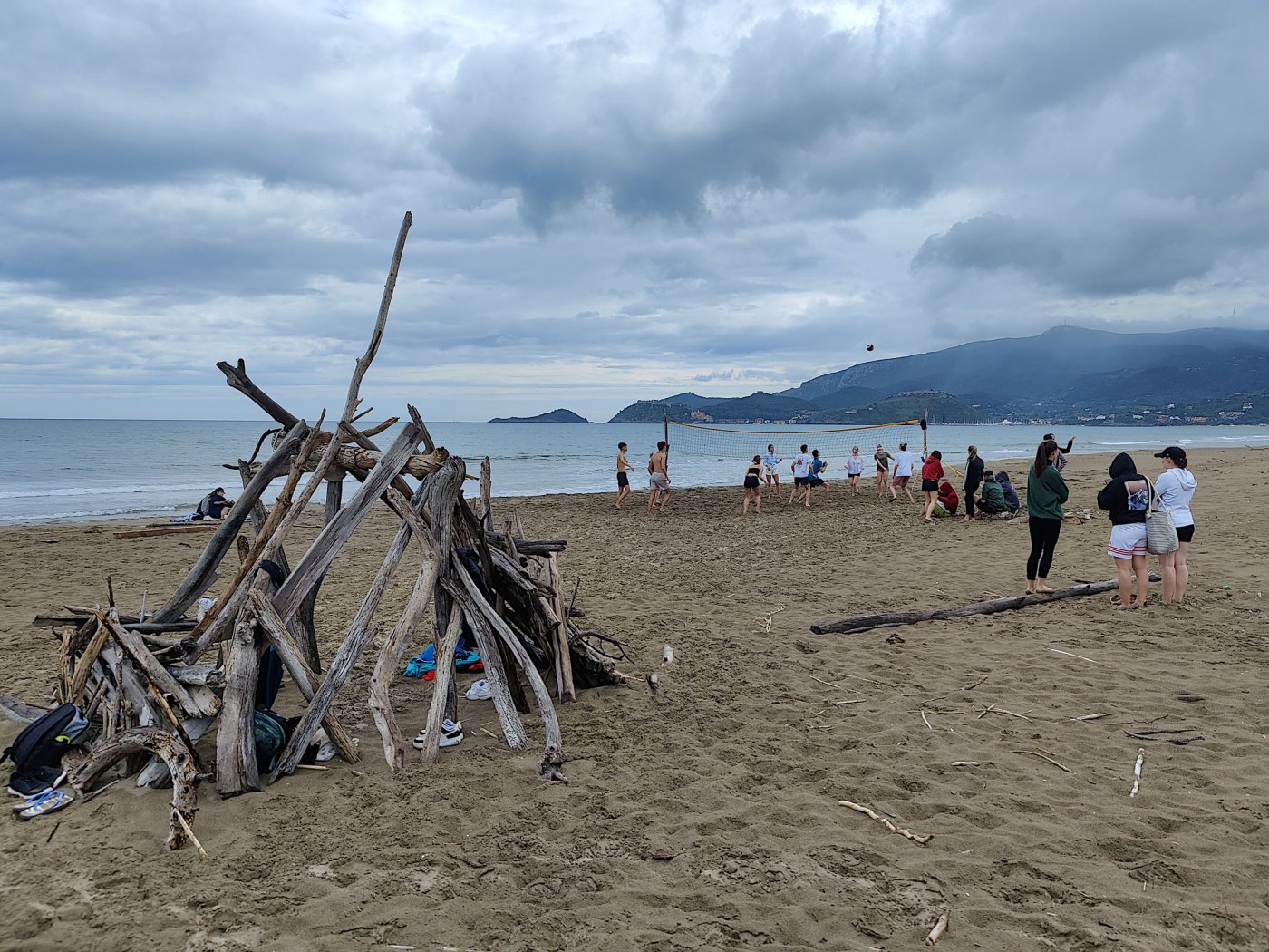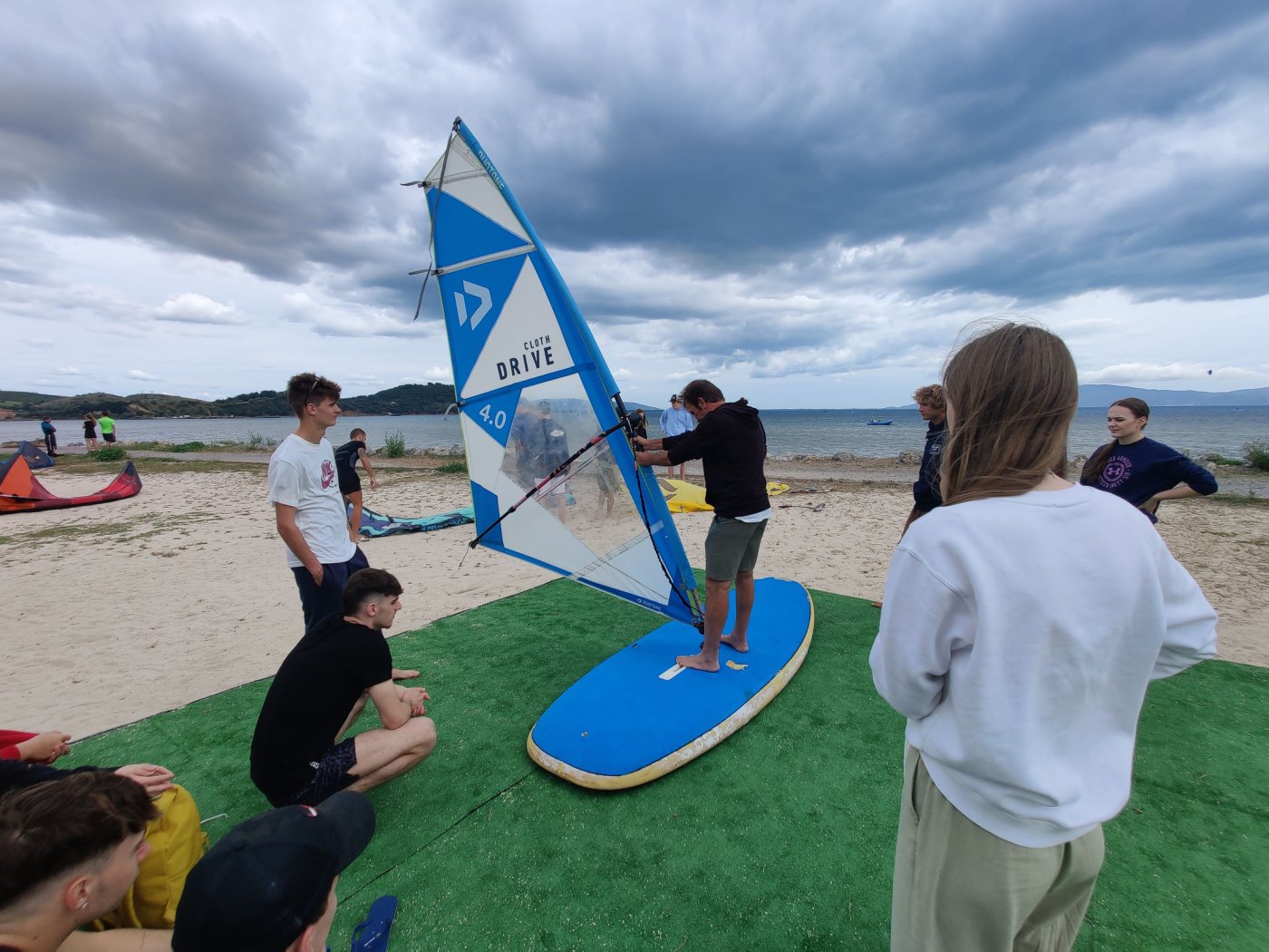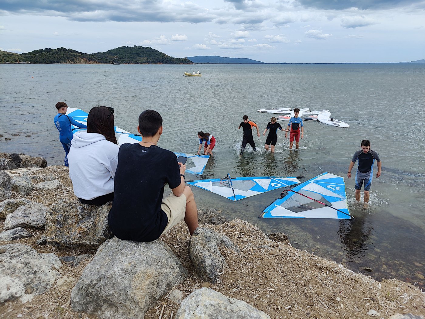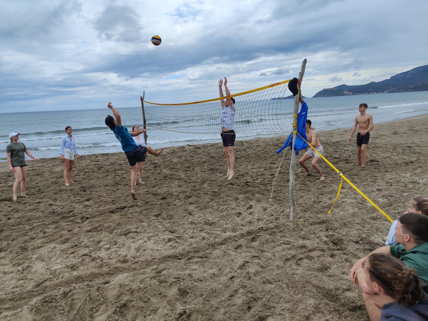 An den Nachmittagen gingen wir dem Sport nach. Auf dem Programm standen zahlreiche Aktivitäten, darunter ein Windsurf- und Kitekurs. Welche der beiden Sportarten man erlernen wollte, entschied jeder selbst. Leider fiel eine der drei geplanten Surfeinheiten ins Wasser. Wir nutzten die uns zur Verfügung stehende Zeit aber bestmöglich aus. Nach einer sehr genauen und ausführlichen Theorieeinheit fanden sich die Windsurfer bereits am Montag im Wasser wieder. Mit dem Wind zwischen den Schultern versuchten wir dort so manchen Meter zu bewältigen, was uns auch schneller als gedacht gelang. Schon bald beherrschten wir unser Surfbrett ausreichend und glitten über das Meer. Die Kitesurfer litten sehr unter den widrigen Wetterbedingungen. Der Wind war schlecht, und so begnügten sich die topmotivierten Kiteschüler mit dem Stand-Up Paddle. Am 2. Tag waen die Windverhältnisse besser, und die Schirme stiegen endlich in den Himmel. Trotz Regen fanden wir sehr lange Spaß an den uns fremden Sportarten im Meer. Am regnerischen Dienstag besuchten wir den “Porto Ercole”. Bevor wir am Strand Beachvolleyball spielten und die Harten unter uns schwimmen gingen, wanderten wir zur “Rocca spagnola”, einer Burg auf einer Anhöhe des Monte Argentario. Die Radtour ging am Mittwoch vonstatten. Mit geliehenen Fahrrädern fuhren wir an den Strand, an dem sich der Tag nach kurzem intensivem Regenschauer doch noch zu einem Höhepunkt der Reise entwickelte. Am menschenleeren Strand spielten wir nämlich Beachvolleyball auf einem selbst errichteten Feld und hatten jede Menge Spaß.