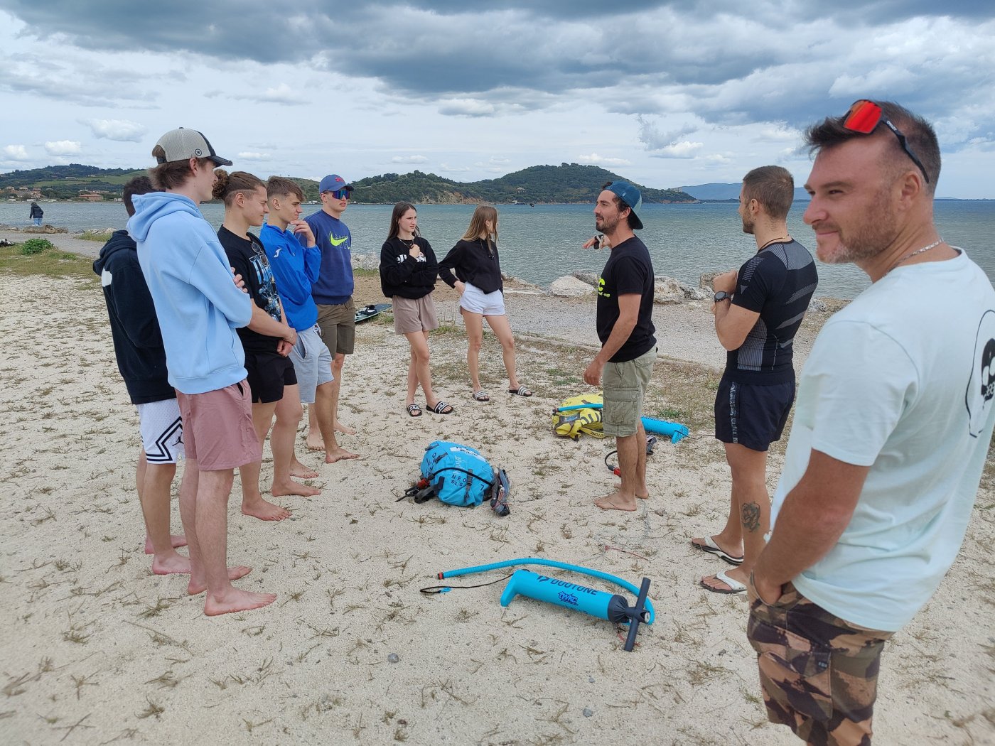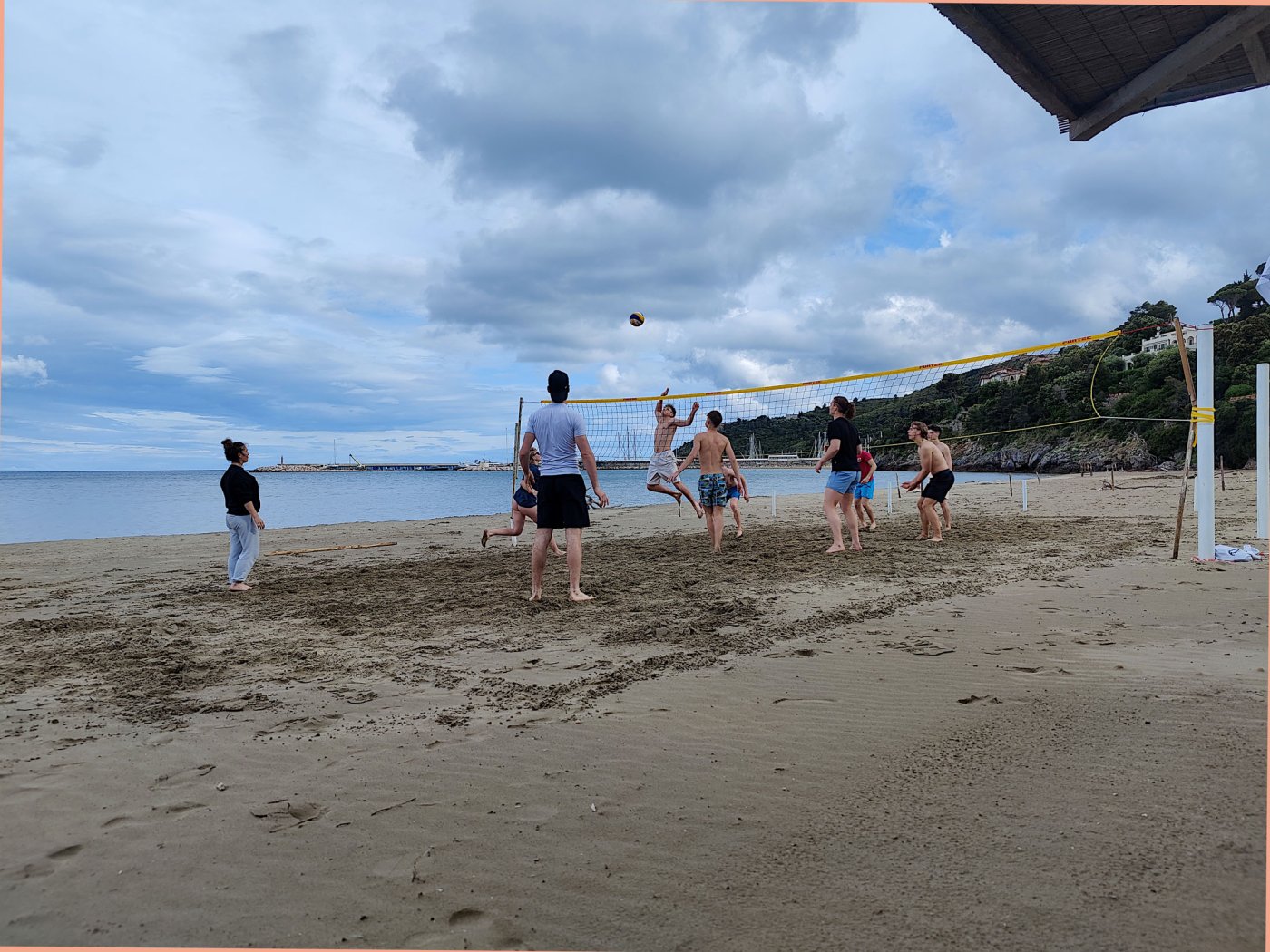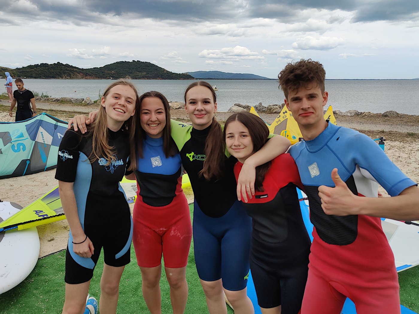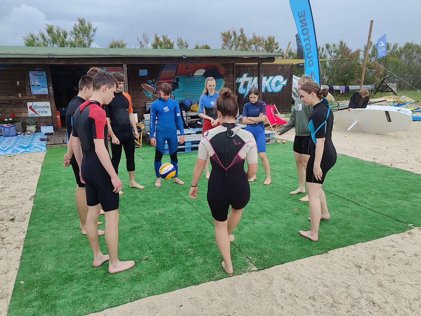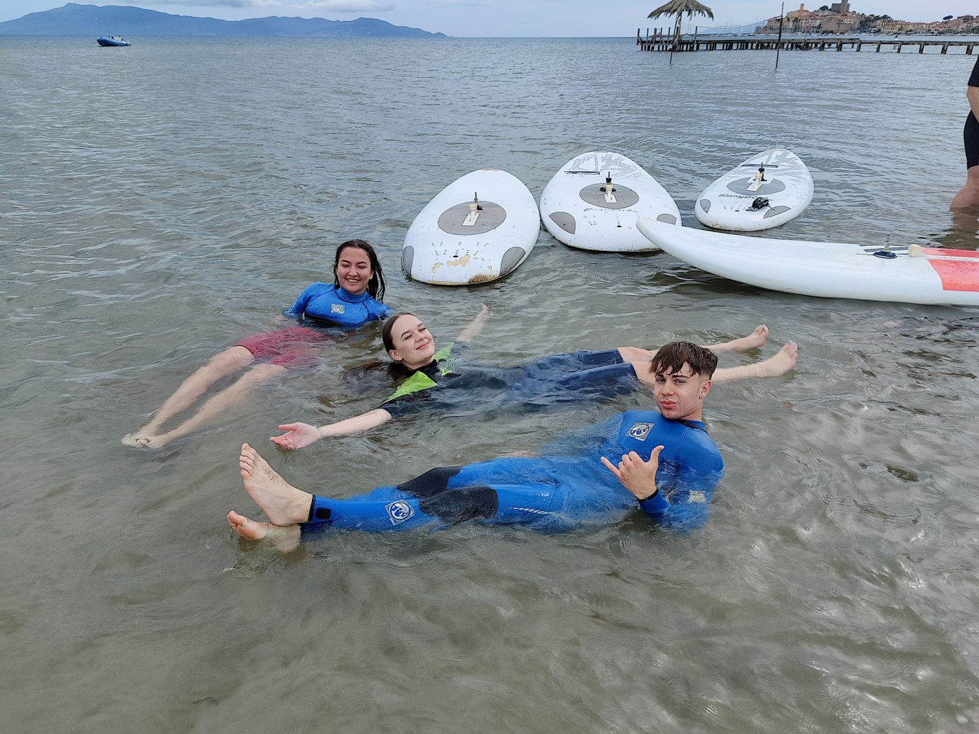 An den Nachmittagen gingen wir dem Sport nach. Auf dem Programm standen zahlreiche Aktivitäten, darunter ein Windsurf- und Kitekurs. Welche der beiden Sportarten man erlernen wollte, entschied jeder selbst. Leider fiel eine der drei geplanten Surfeinheiten ins Wasser. Wir nutzten die uns zur Verfügung stehende Zeit aber bestmöglich aus. Nach einer sehr genauen und ausführlichen Theorieeinheit fanden sich die Windsurfer bereits am Montag im Wasser wieder. Mit dem Wind zwischen den Schultern versuchten wir dort so manchen Meter zu bewältigen, was uns auch schneller als gedacht gelang. Schon bald beherrschten wir unser Surfbrett ausreichend und glitten über das Meer. Die Kitesurfer litten sehr unter den widrigen Wetterbedingungen. Der Wind war schlecht, und so begnügten sich die topmotivierten Kiteschüler mit dem Stand-Up Paddle. Am 2. Tag waen die Windverhältnisse besser, und die Schirme stiegen endlich in den Himmel. Trotz Regen fanden wir sehr lange Spaß an den uns fremden Sportarten im Meer. Am regnerischen Dienstag besuchten wir den “Porto Ercole”. Bevor wir am Strand Beachvolleyball spielten und die Harten unter uns schwimmen gingen, wanderten wir zur “Rocca spagnola”, einer Burg auf einer Anhöhe des Monte Argentario. Die Radtour ging am Mittwoch vonstatten. Mit geliehenen Fahrrädern fuhren wir an den Strand, an dem sich der Tag nach kurzem intensivem Regenschauer doch noch zu einem Höhepunkt der Reise entwickelte. Am menschenleeren Strand spielten wir nämlich Beachvolleyball auf einem selbst errichteten Feld und hatten jede Menge Spaß.