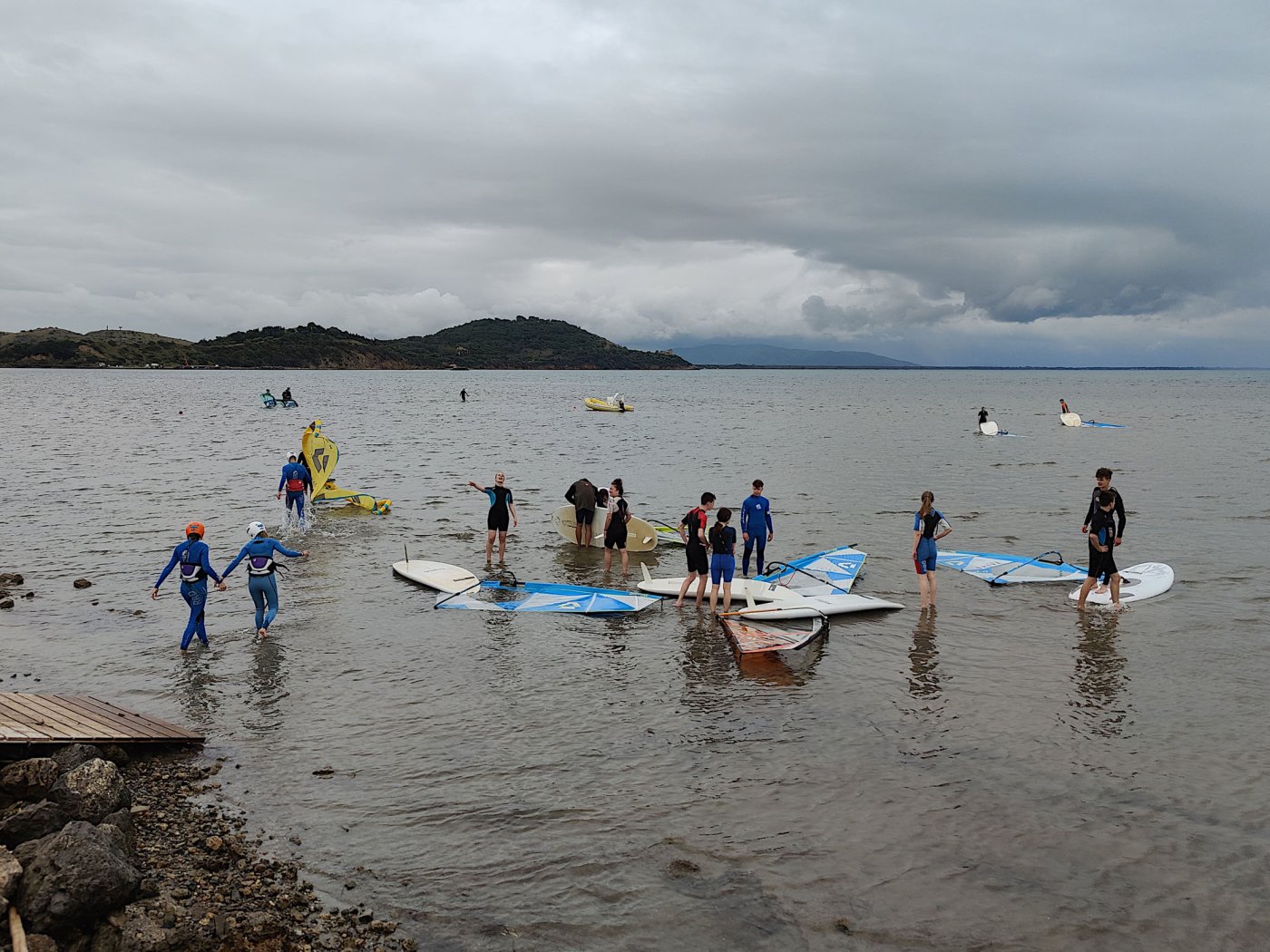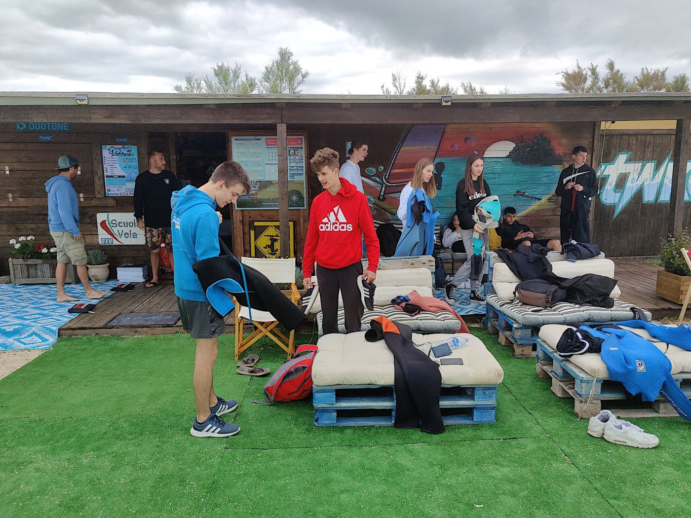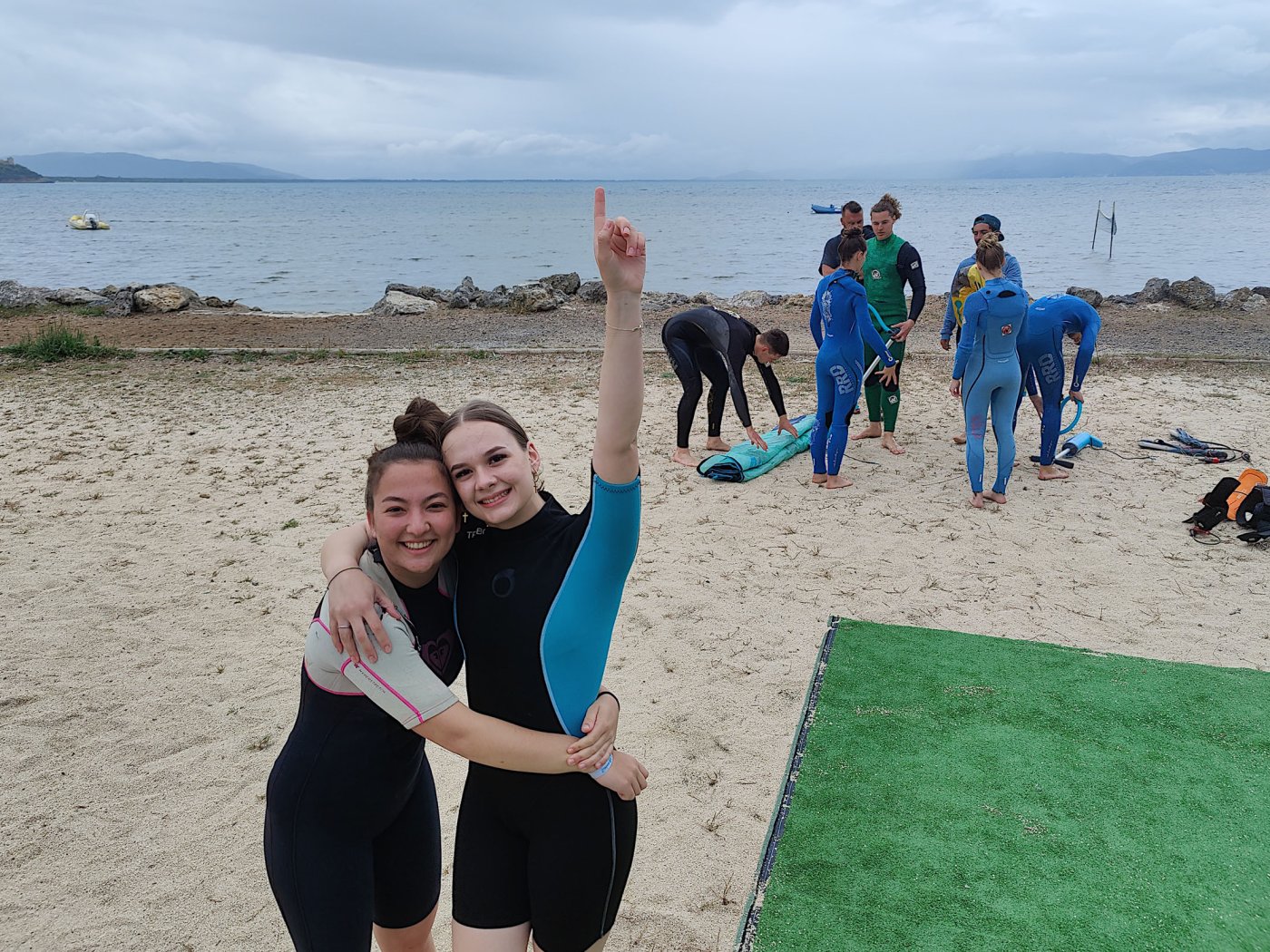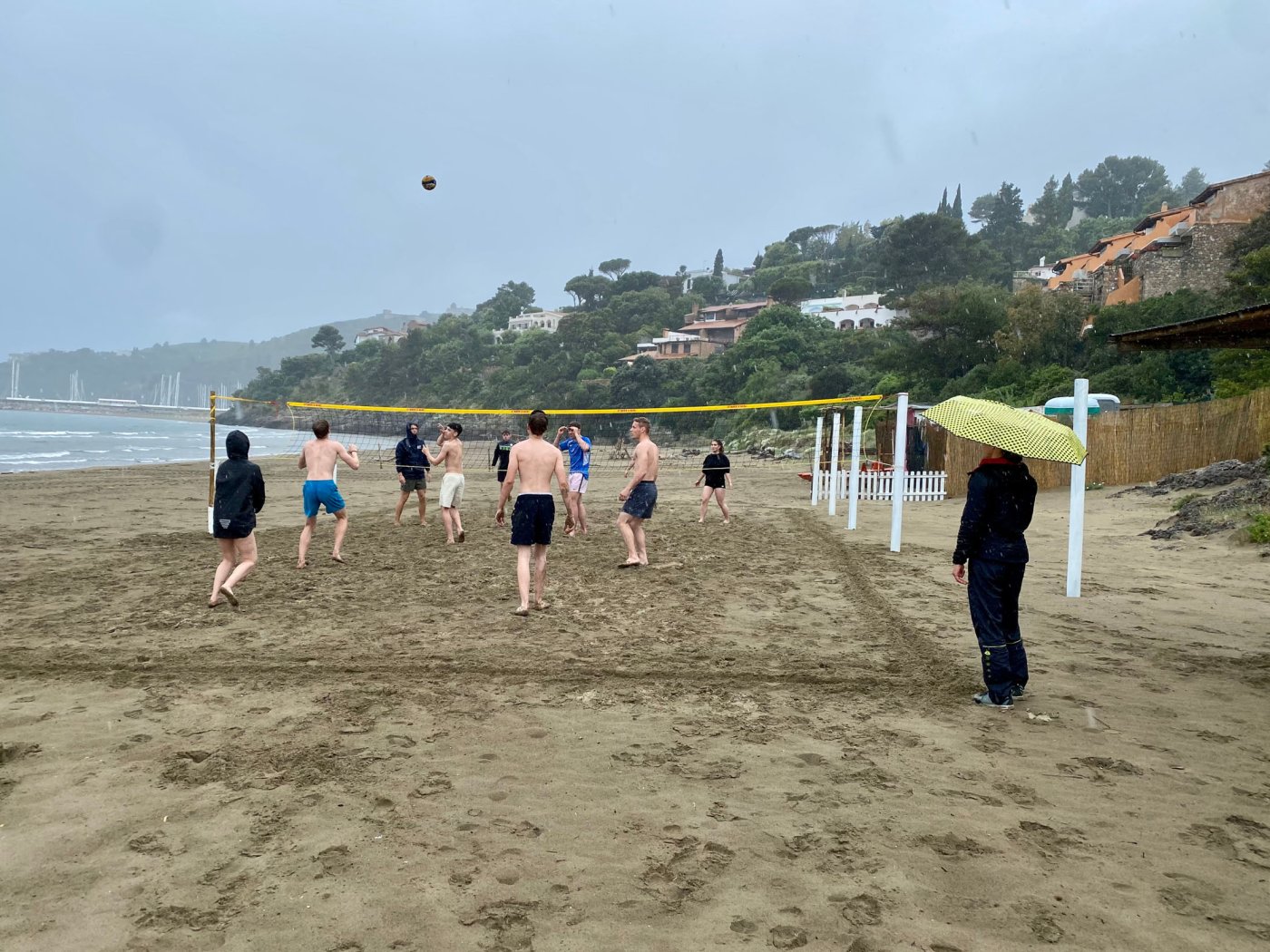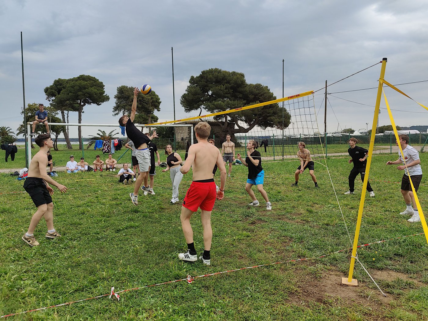 An den Nachmittagen gingen wir dem Sport nach. Auf dem Programm standen zahlreiche Aktivitäten, darunter ein Windsurf- und Kitekurs. Welche der beiden Sportarten man erlernen wollte, entschied jeder selbst. Leider fiel eine der drei geplanten Surfeinheiten ins Wasser. Wir nutzten die uns zur Verfügung stehende Zeit aber bestmöglich aus. Nach einer sehr genauen und ausführlichen Theorieeinheit fanden sich die Windsurfer bereits am Montag im Wasser wieder. Mit dem Wind zwischen den Schultern versuchten wir dort so manchen Meter zu bewältigen, was uns auch schneller als gedacht gelang. Schon bald beherrschten wir unser Surfbrett ausreichend und glitten über das Meer. Die Kitesurfer litten sehr unter den widrigen Wetterbedingungen. Der Wind war schlecht, und so begnügten sich die topmotivierten Kiteschüler mit dem Stand-Up Paddle. Am 2. Tag waen die Windverhältnisse besser, und die Schirme stiegen endlich in den Himmel. Trotz Regen fanden wir sehr lange Spaß an den uns fremden Sportarten im Meer. Am regnerischen Dienstag besuchten wir den “Porto Ercole”. Bevor wir am Strand Beachvolleyball spielten und die Harten unter uns schwimmen gingen, wanderten wir zur “Rocca spagnola”, einer Burg auf einer Anhöhe des Monte Argentario. Die Radtour ging am Mittwoch vonstatten. Mit geliehenen Fahrrädern fuhren wir an den Strand, an dem sich der Tag nach kurzem intensivem Regenschauer doch noch zu einem Höhepunkt der Reise entwickelte. Am menschenleeren Strand spielten wir nämlich Beachvolleyball auf einem selbst errichteten Feld und hatten jede Menge Spaß.