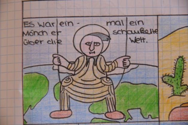 Die Schülerinnen und Schüler nehmen den vormittelalterlichen Schaukelmönch aus der St. Prokuluskirche bei Naturns als Ausgangslage für ihr eigenes Comic. Sie stellen sich der Herausforderung, aus der „ungewissen Situation“ des Schaukelmönches eine individuelle Geschichte zu entwickeln. Bildergalerie
