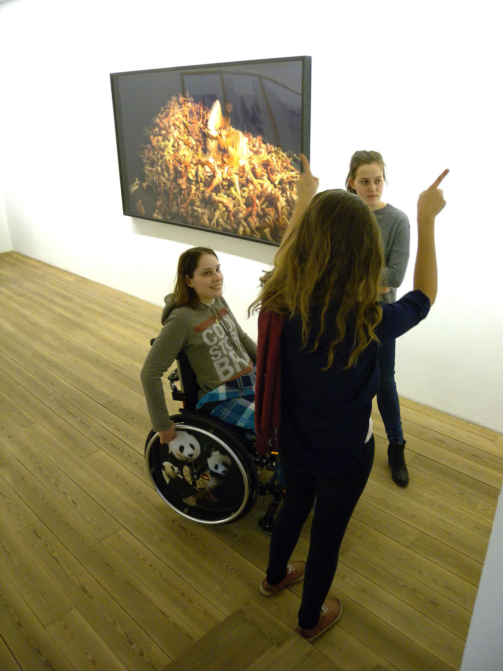 Bereits zum zweiten Mal in diesem Schuljahr haben sich einzelne Schülerinnen und Schüler des Kunstgymnasiums 2K, 2L und 3D sowie des Sprachengymnasiums 5A bereit erklärt an einem freien Nachmittag ihre Mitschüler mit besonderen Bedürfnissen und deren Betreuer durch die aktuelle Ausstellung im Kunsthaus Meran zu führen. Nach einem kurzen Kennenlernen und einem kleinen „Berührungsspiel“ sind die Schülerpaare durch die Ausstellung „Gestures- woman in action“ gegangen, haben sich mit der Performancekunst und der Rolle der Frau in der Kunst auseinandergesetzt. Auch wenn die Thematik nicht auf Anhieb verständlich erschien, so ist es doch gelungen einen Weg zu finden mittels der betrachteten Kunstwerke auf die weibliche Komponente in der Kunst einzugehen, gesellschaftliche Entwicklungen zu erkennen und Kunst als Spiegel ihrer Zeit zu verstehen.