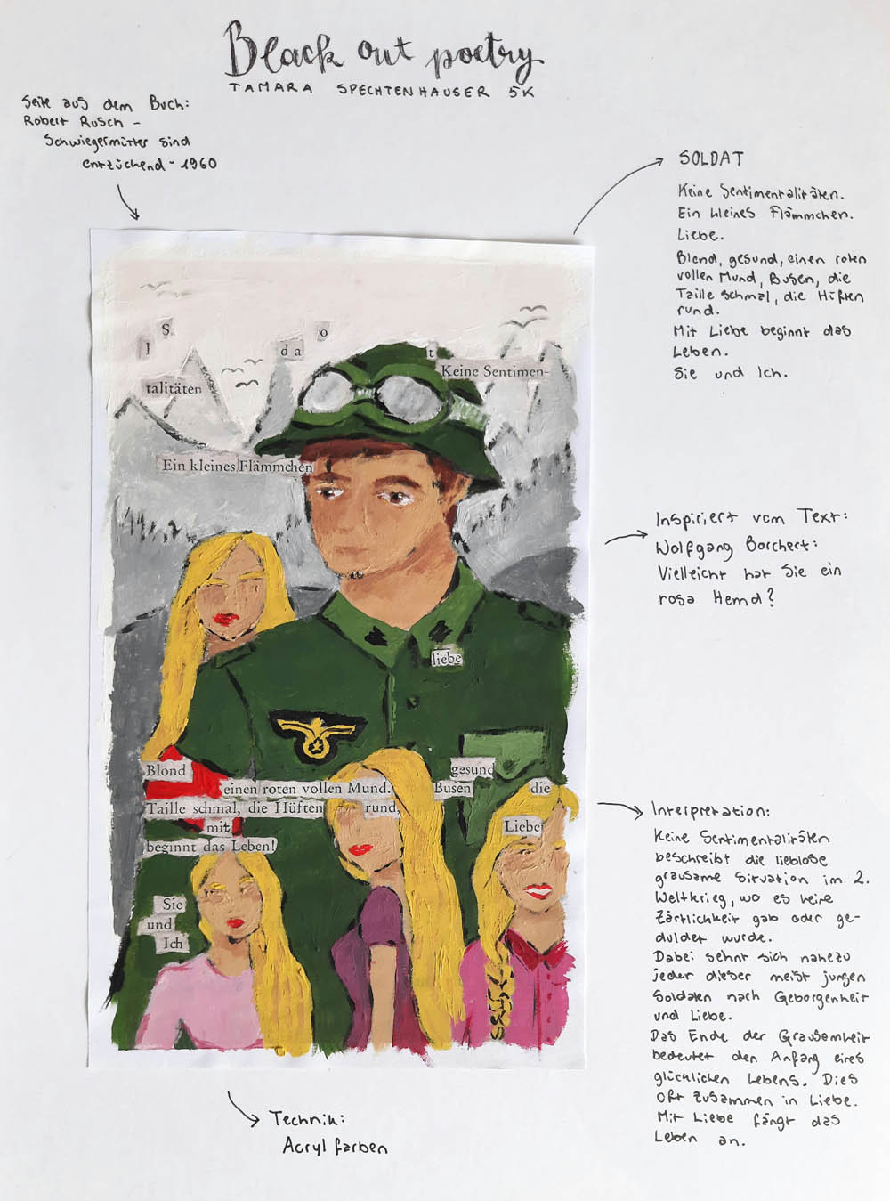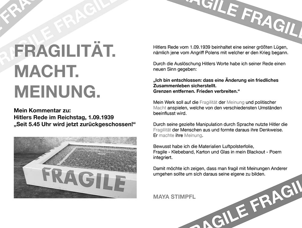 Inspiriert wurden wir von Themen, mit denen wir uns im heurigen Schuljahr befasst haben wie z.b. unserer Klassenlektüre “Jugend ohne Gott”, dem Theaterstück “Biedermann und die Brandstifter” (VBB), sowie im Geschichtsunterricht behandelte Themen. Unsere Werke werden fortlaufend auf der Instagram Seite @gymmeart gepostet. Mehr zu den einzelnen Gedichten findet Ihr in der jeweiligen Instagram-caption.