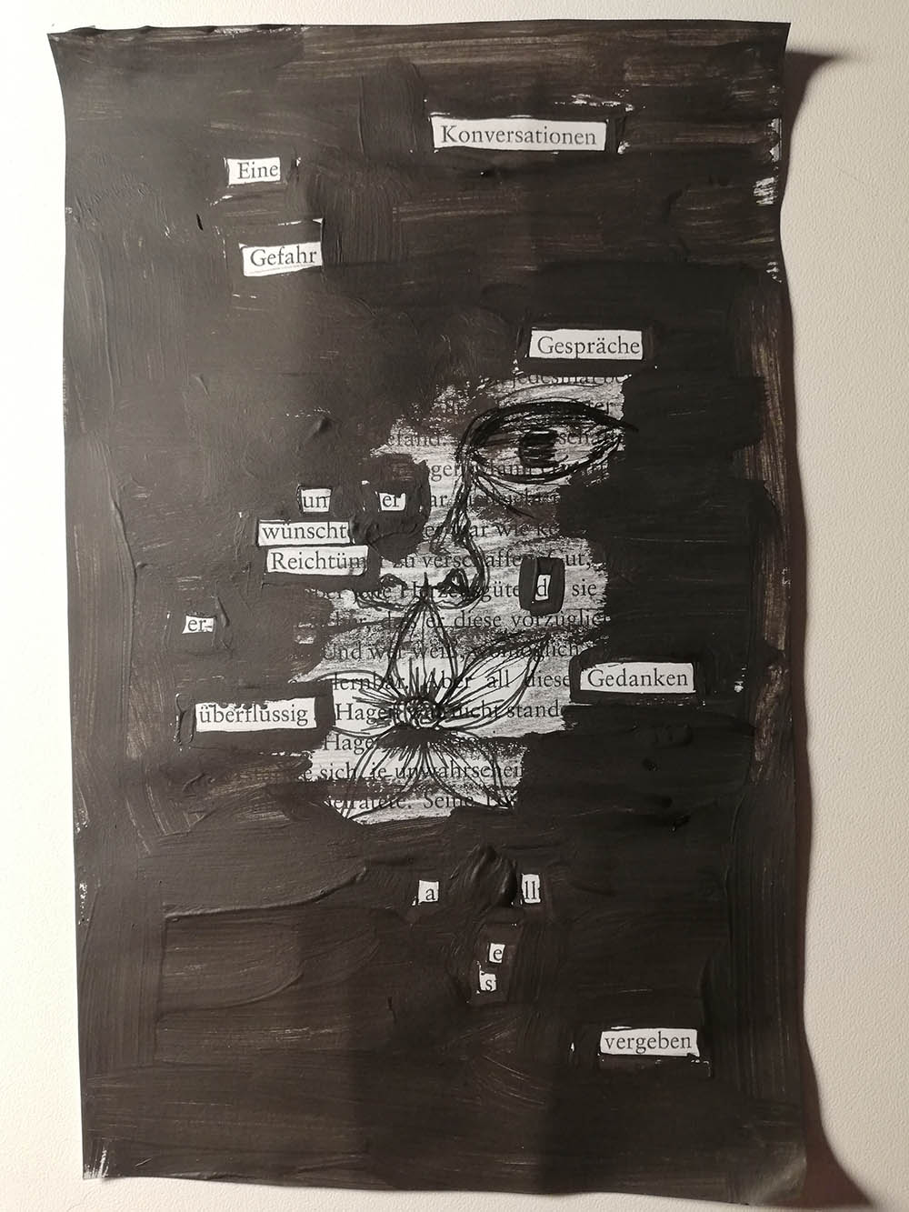 BLACK OUT POETRY, BLACK OUT POEMS entstehen in einem kreativen Prozess, bei dem ein:e Dichter:in ein bestehendes Werk verfremdet in dem er/sie bestimmte Worte hervorhebt und andere schwarz übermalt.