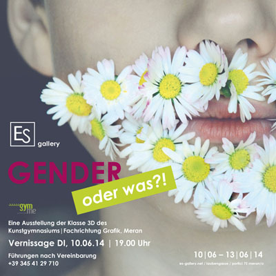Erwin Seppi, der Galerist der Es-Gallery Meran hat seine Galerie für die Schüler_innen der 3D des Kunstgymnasiums Meran, Fachrichtung Grafik in diesen letzten Schultagen geöffnet und gibt ihnen Gelegenheit ihre Kunstwerke der Öffentlichkeit vorzustellen. Von der Erarbeitung der Werke bis zur Öffentlichkeitsarbeit, Aufsicht, Führungen können die Schüler_innen die Realität einer Galerie kennenlernen. Das Thema "Gender" wurde in den letzten Monaten von den Schüler_innen recherchiert und unter der Leitung von Elisabeth Hölzl in eigenen Kunstobjekten reflektiert. Was ist typisch Frau? Was typisch Mann? Was ist angeboren? Was ist anerzogen? Stark, schön? Blau? Pink? Gibt es dieses „typisch" Weibliche und Männliche überhaupt? Die Arbeiten streifen die unterschiedlichsten Medien wie Fotografie, Video, Rauminstallation, Malerei und Zeichnung und wurden auch ausserhalb des Unterrichts realisiert. Der Gesamteindruck ist der einer gut aufeinander abgestimmten Auswahl von Werken, die auf die Räumlichkeiten der Galerie reagieren. Eine Infothek zu einzelnen Begriffen der Genderfrage bietet Hintergrundwissen zum Thema und zu den Kunstwerken an.