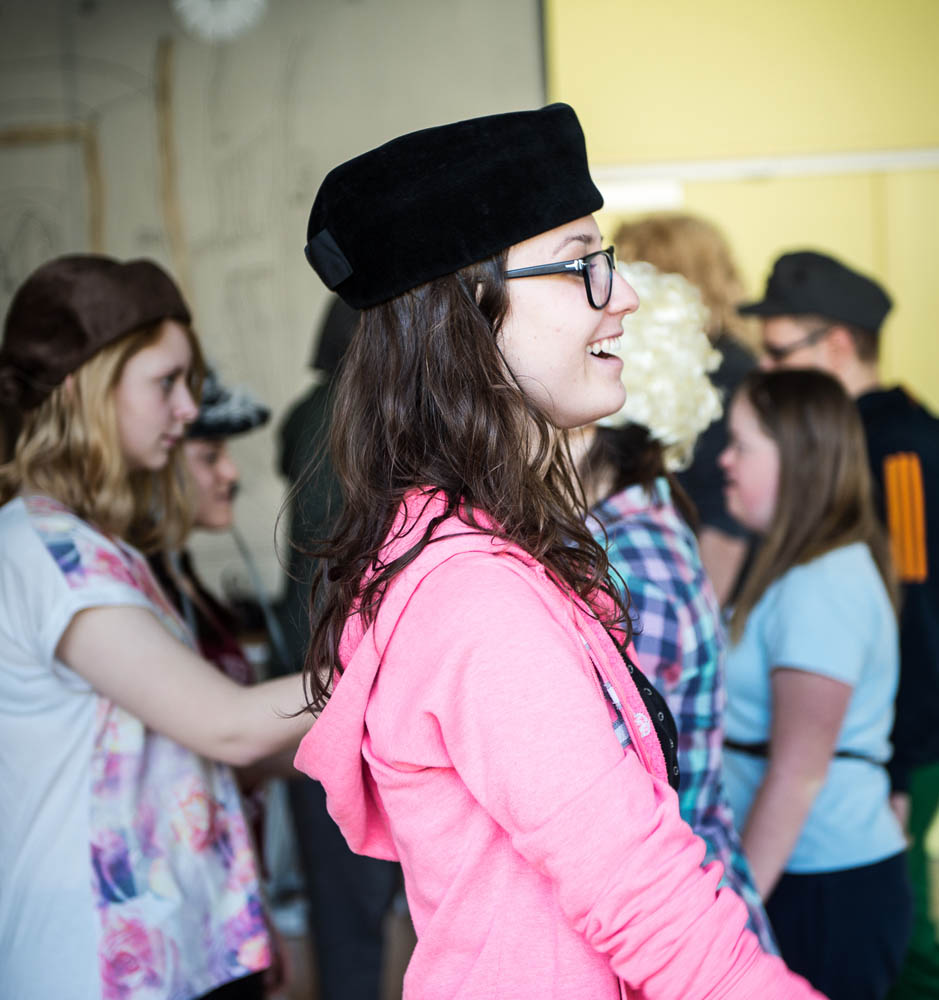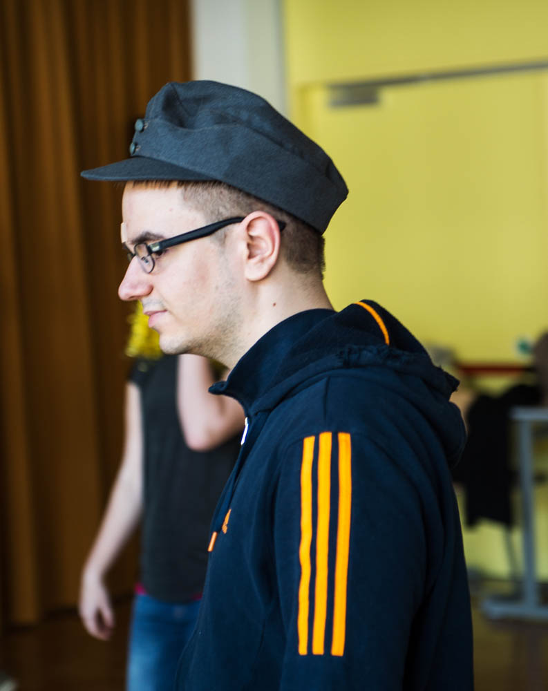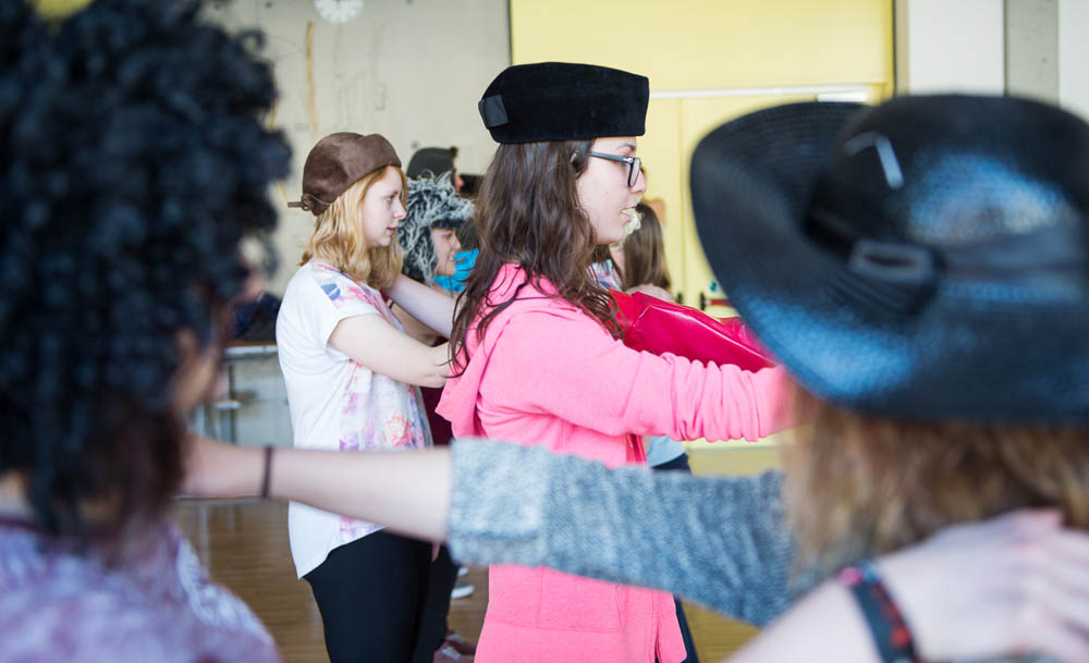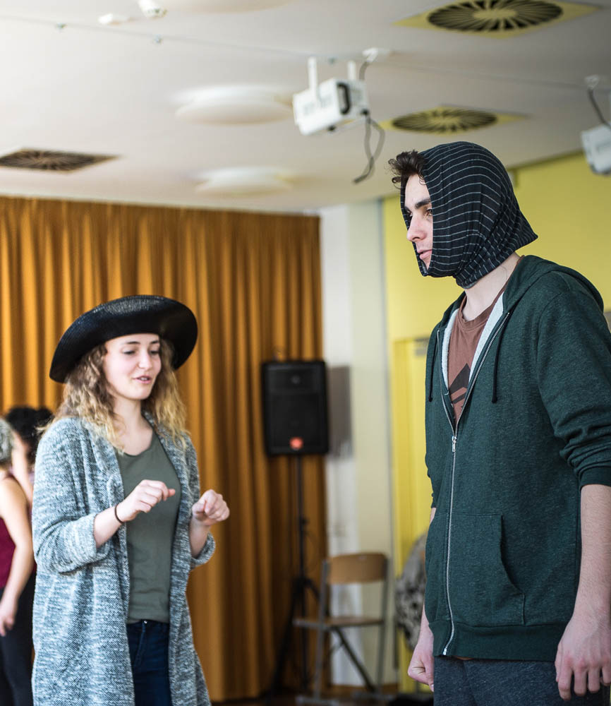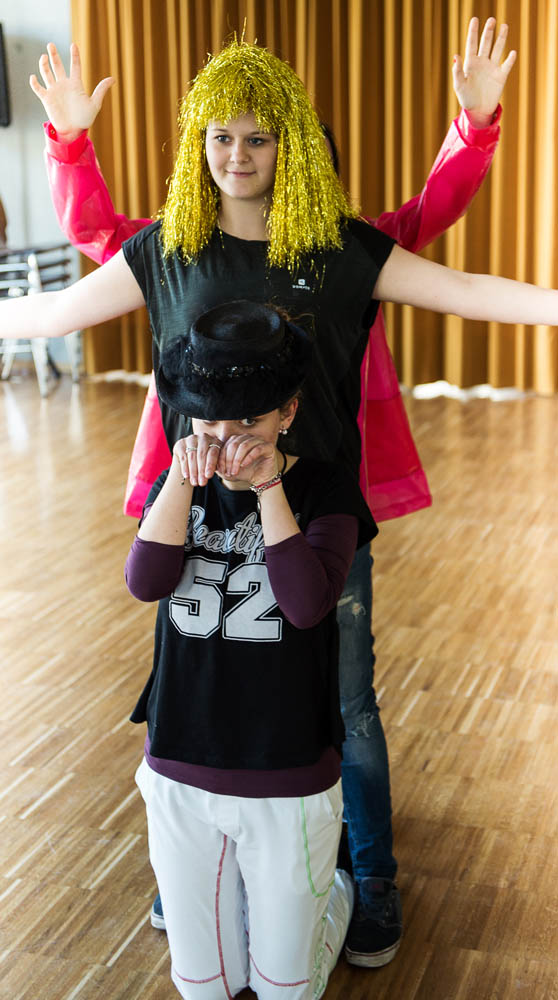 Der Körper wird als Werkzeug benutzt und bezüglich seines Bewegungspotentials erforscht. Accessoires wie Hüte und Koffer ermöglichen es in eine Rolle zu schlüpfen und damit verschiedene Gesten auszuprobieren.