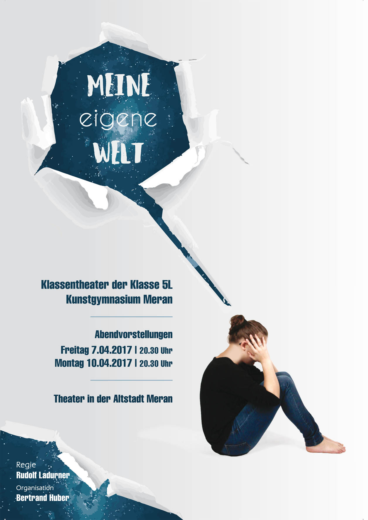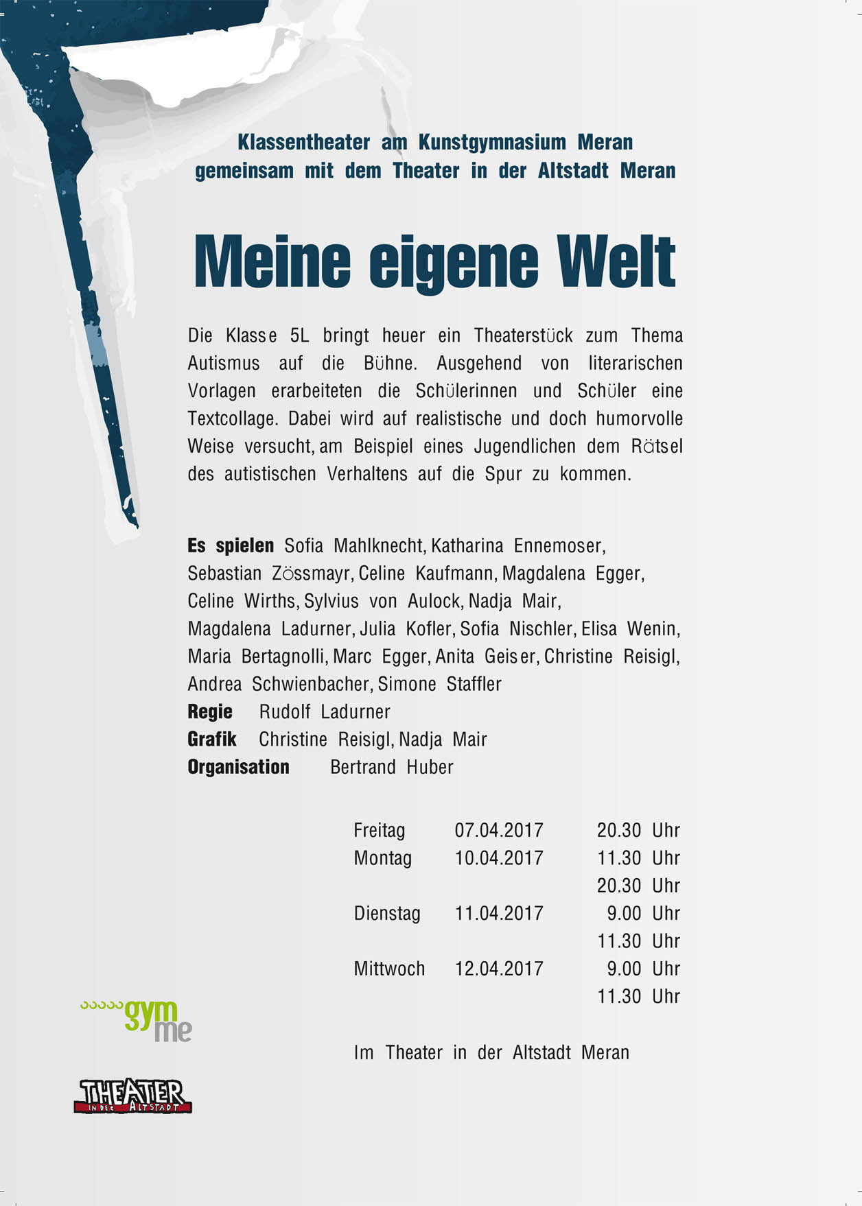 In Zusammenarbeit mit dem Theater in der Altstadt Meran bringt die Klasse 5L des Kunstgymnasiums Meran das Klassentheater "Meine eigene Welt" zum Thema Autismus auf die Bühne. Ausgehend von literarischen Vorlagen erarbeiteten die Schülerinnen und Schüler eine Textcollage. Dabei wird auf realistische und doch humorvolle Weise versucht, am Beispiel eines Jugendlichen dem Rätsel des autistischen Verhaltens auf die Spur zu kommen.