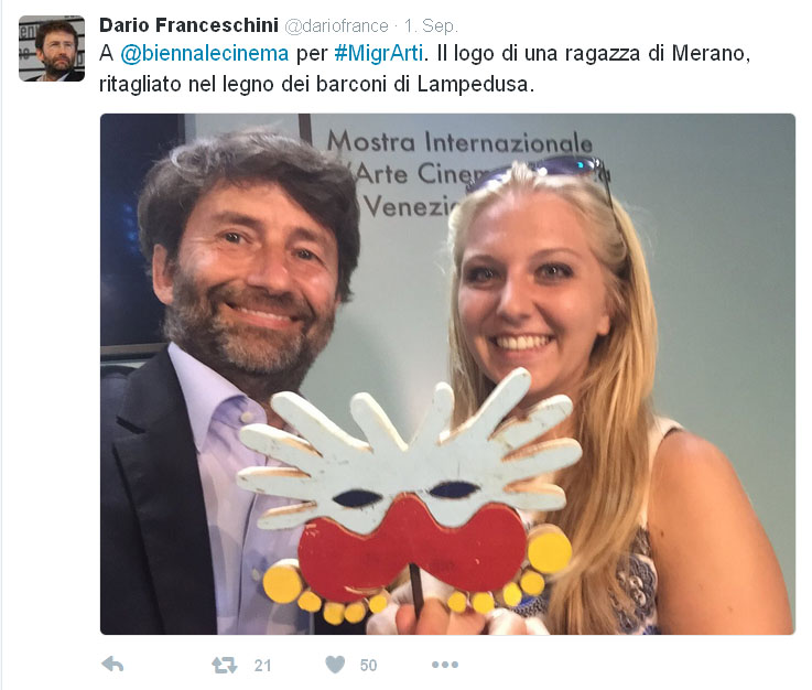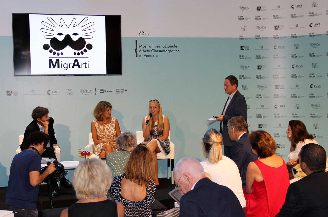 Il logo vincitore è diventato il simbolo di tutta la campagna MigrArti ed è stato presentato a Venezia dal Ministro, alla presenza dell’onorevole Silvia Costa, della direttrice dell’Istituto Centrale per la Grafica di Roma, dott.ssa Antonella Fusco, e del direttore della Mostra del Cinema Alberto Barbera.