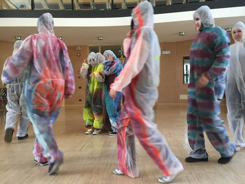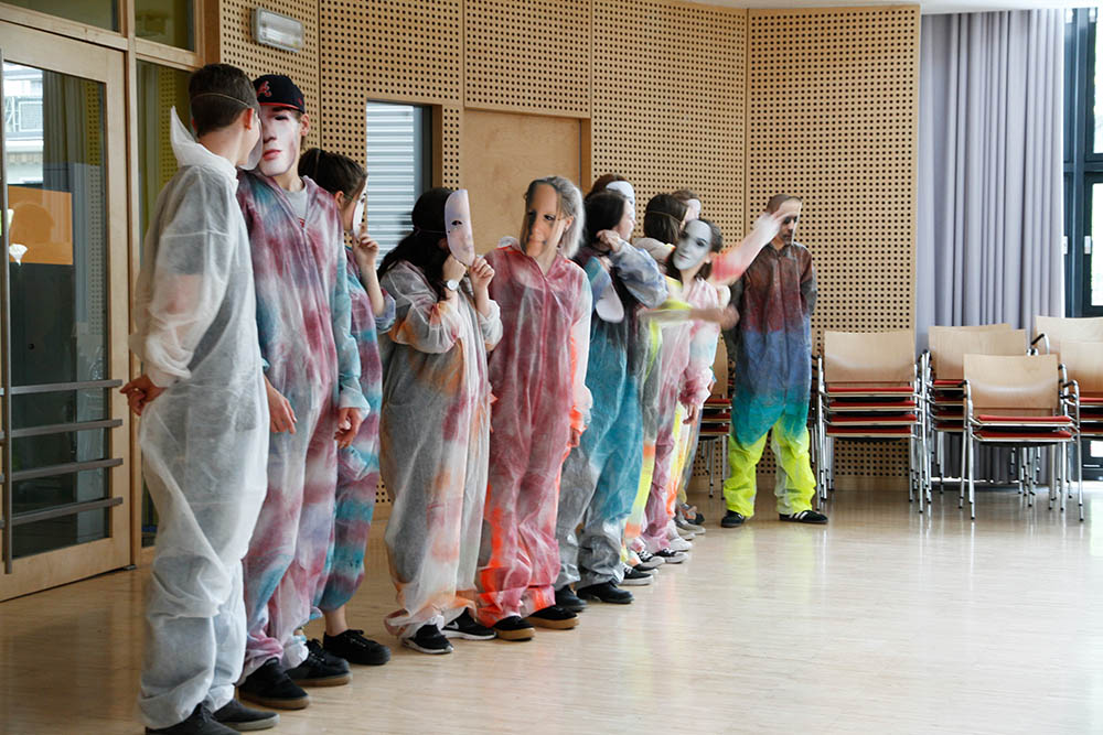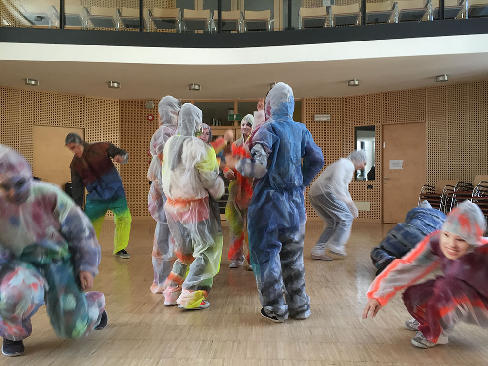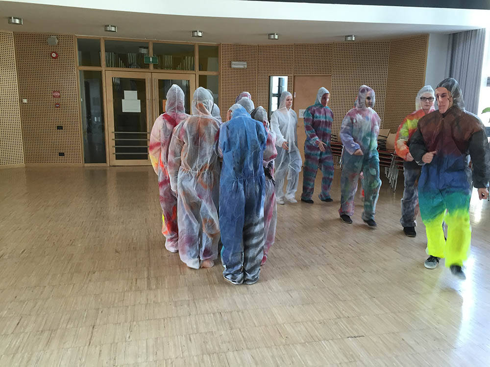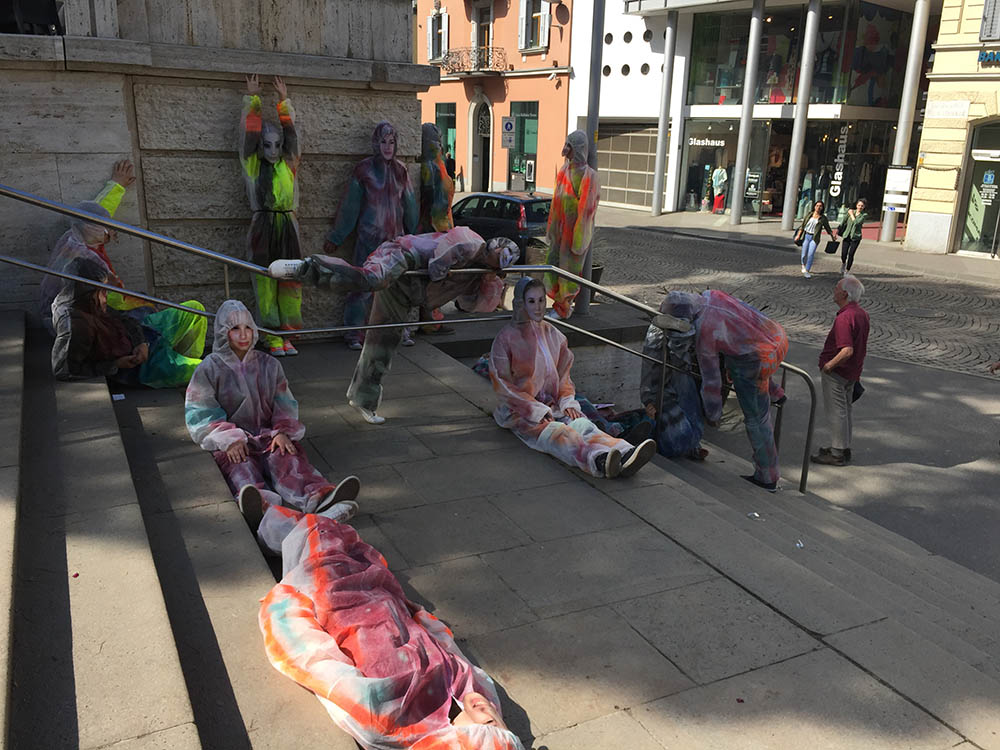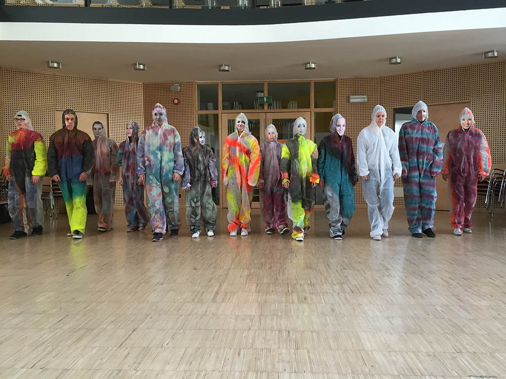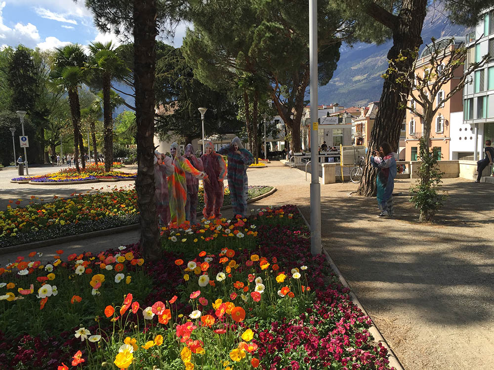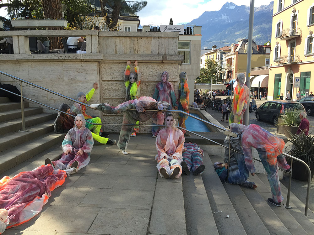 Die in London lebende Künstlerin Barbara Gamper erarbeitete mit den Schülerinnen und Schülern der 3. und 5. Klasse K/Ku ein interessantes Projekt. Ausgehend von performativen Techniken und Körpererfahrung zu den Themen „Wie siehst Du die Zukunft? Real/Virtuell, wo liegt die Grenze? Europa, damals und Heute...? entstanden in Kleingruppen interessante Bewegungsabläufe, welche dann im öffentlichen Raum von Meran aufgeführt und filmisch dokumentiert wurden. In einen Overall gekleidet und mit einer Maske versehen, konnten alle Beteiligten sich in einer neuen und anderen „Rolle“ erleben.