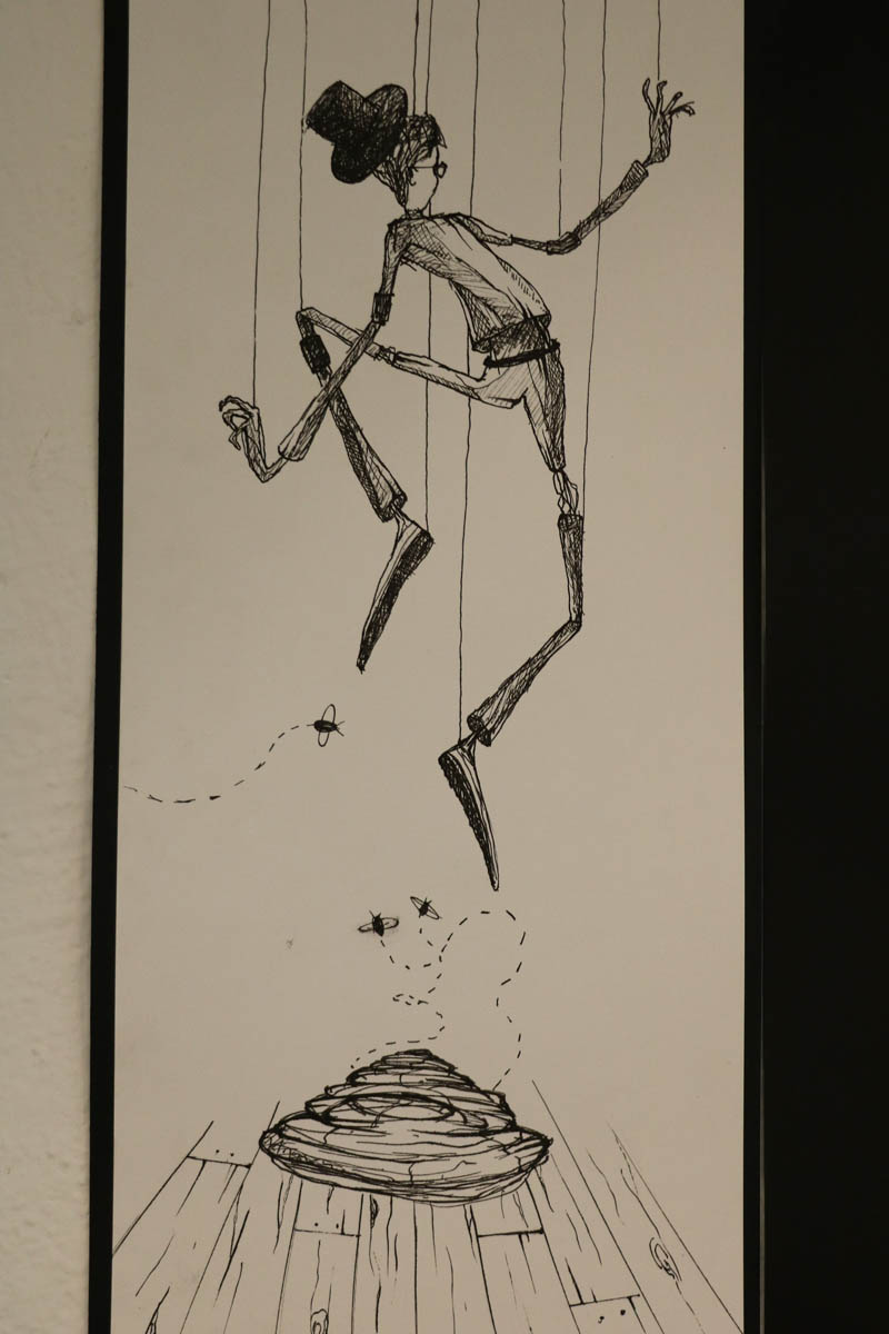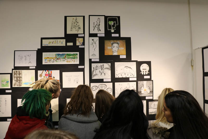 Nach einer Auseinandersetzung mit dem Thema Karikatur fertigten die Schüler/innen zunächst im Kunstwerkstattunterricht Bleistiftskizzen an, um in einem späteren Moment mit Tusche und Feder grafische Arbeiten zu produzieren. Dabei sind bemerkenswerte Tuschezeichnungen entstanden.