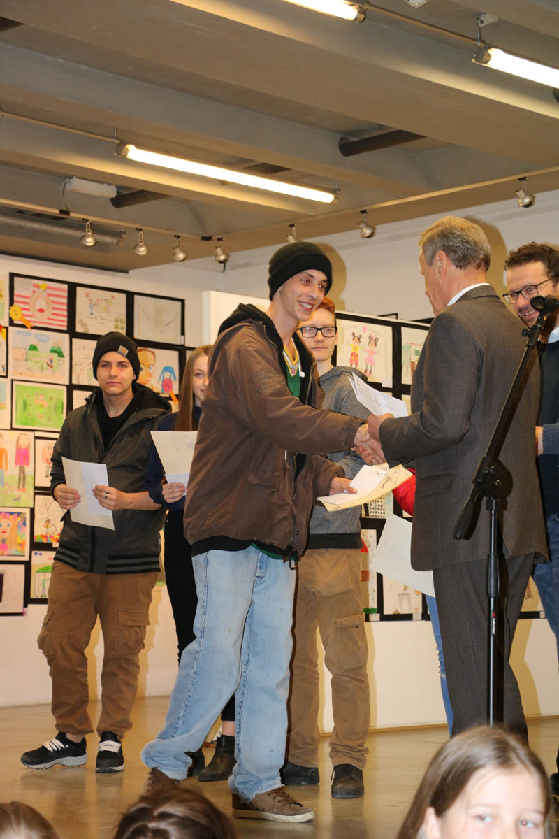 Dass der Schüler Manuel Hintner schließlich gewonnen hat erfüllt uns alle mit großer Freude und auch ein wenig Stolz. Zur Prämierung wurde die ganze Klasse nach Bruneck ins Museum eingeladen, wo Manuel Hintner den 2. Platz in der Kategorie Oberschule in Form von 120€ Preisgeld entgegennehmen konnte. Allen Mitschülern wurde eine Urkunde überreicht. Außerdem werden wir Manuel wohl in nächster Zeit mit seiner auf ein T-shirt gedruckten Karikatur antreffen.