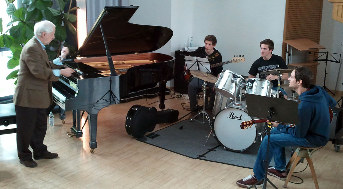 Simon Enz am Bass, Julian Gruber am Schlagzeug und Martin Zanluchi an der Gitarre lauschen den Anweisungen des Maestro.