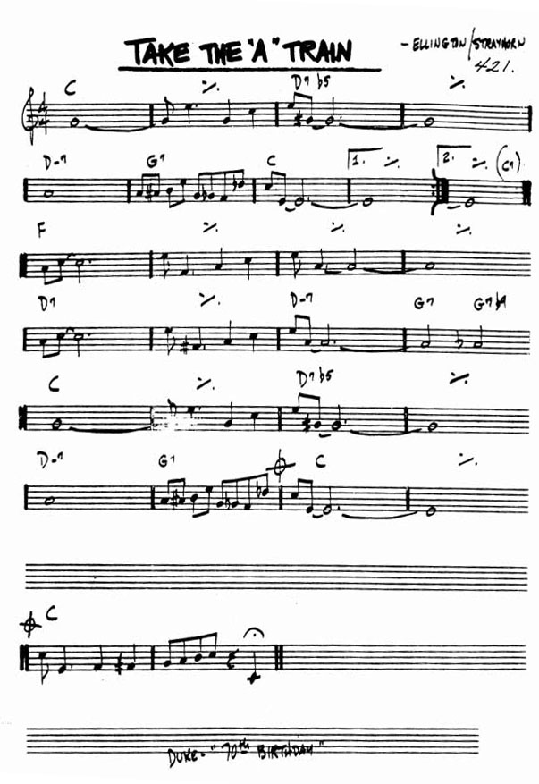 Franco D'Andrea führte die Schülerinnen und Schüler etlicher Klassen des Sozialwissenschaftlichen Gymnasiums mit Landesschwerpunkt Musik anhand des Duke Ellington Standards "Take The A Train" in den Jazz ein. Dabei ging er auf die Geschichte dieses sehr bekannten Standards von Billy Strayhorn ein, beschrieb dessen musikalische Struktur und zeigte Schritt für Schritt, auf welche Weise Jazzmusiker aus der kargen Vorlage (siehe rechts) eigene, ansprechende Interpretationen gestalten, wobei diese Interpretationen zu einem großen Teil auf mehr oder weniger strukturierte Improvisationen beruhen. Die Zuhörer/innen in der Aula hörten mit, wie das Stück immer wieder aufgerollt wurde, aber jedesmal anders klang. Dabei zeigte D'Andrea den Schülern, die ihn begleiteten, wie das Original abstrahiert werden kann - im melodischen und rhythmischen Sinne. Die recht komplexen harmonischen Variationsmöglichkeiten des Jazz hätten den Rahmen dieser Vorstellung gesprengt; aufmerksame Zuhörer hatten allerdings die Gelegenheit, Beispiele dafür in Franco D'Andreas Klavierspiel zu hören.