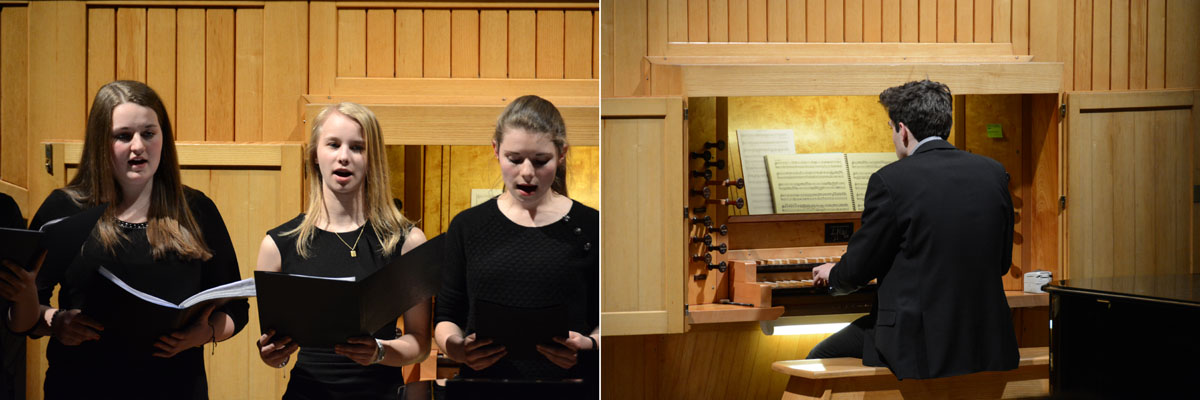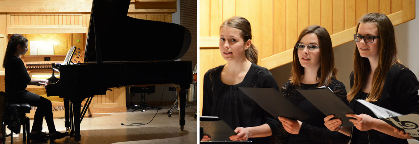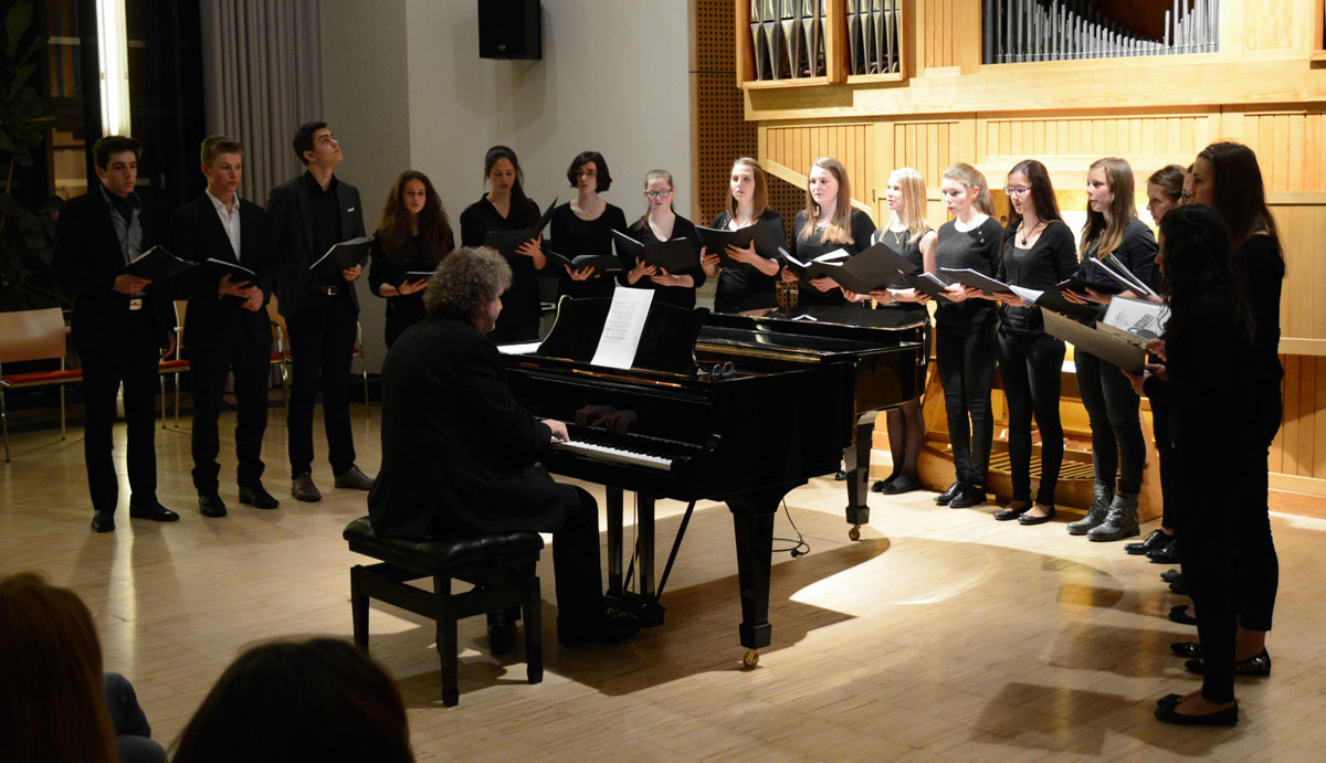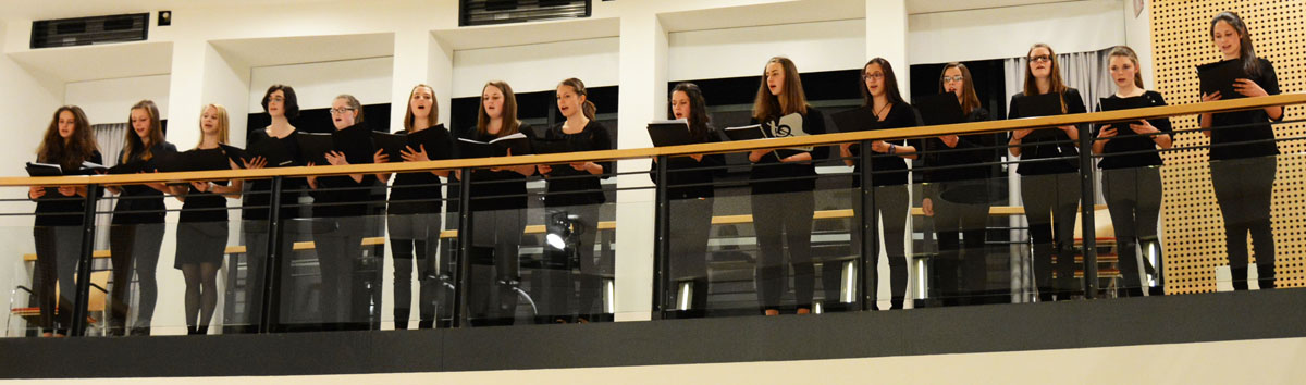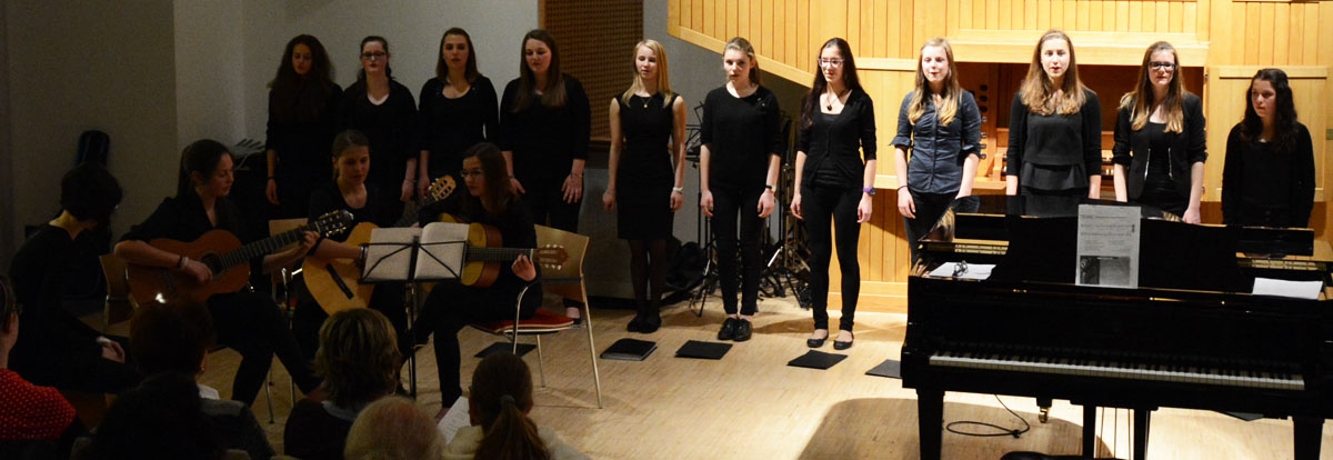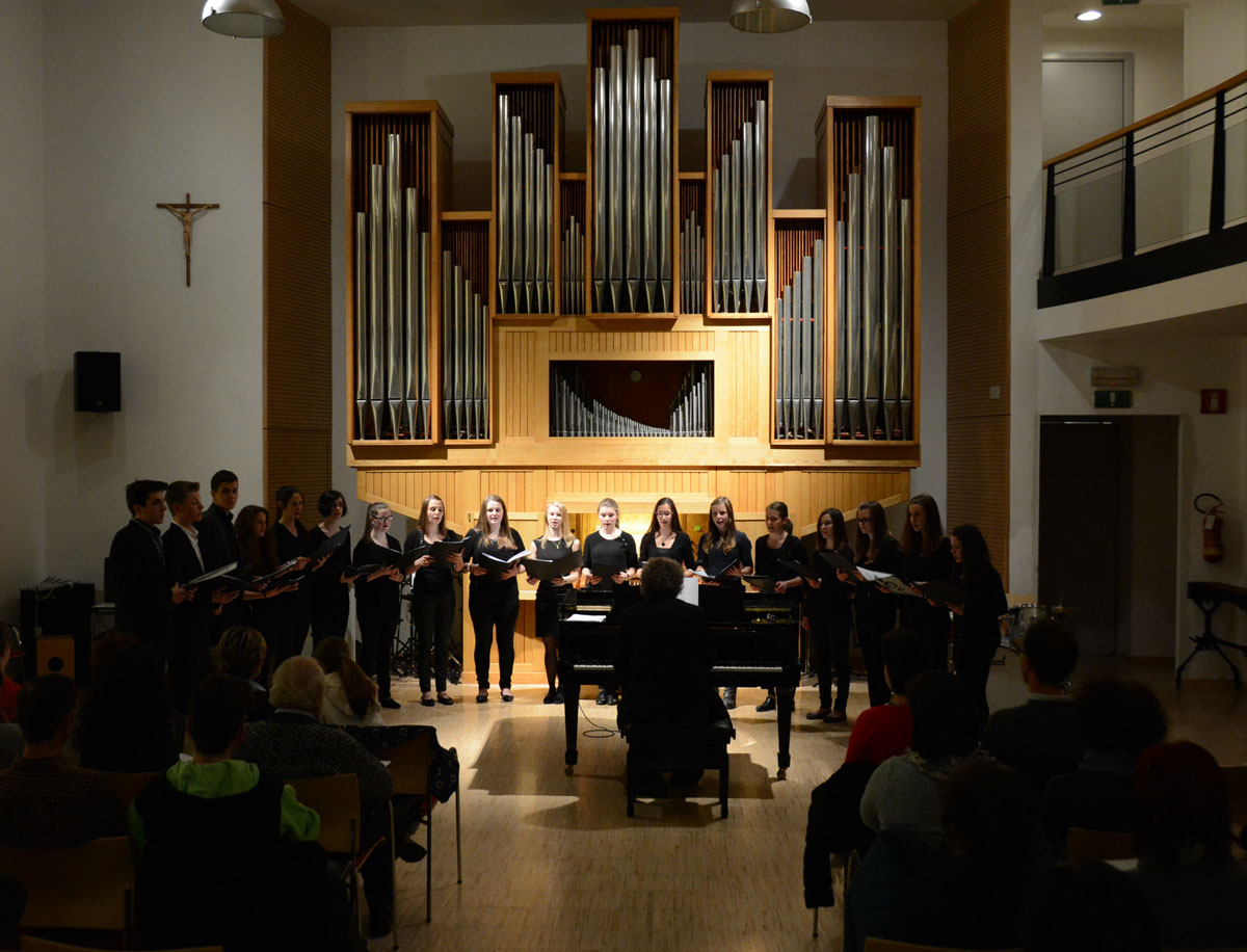 Die Schülerinnen und Schüler der Klasse 2C des Landesschwerpunktes Musik haben am 18. März 2015 in der Aula Magna ein Konzert veranstaltet. Unter der Leitung von Prof. Stephan Kofler sang der Klassenchor Werke von Bartolomeo Cordans, Johann Pachelbel, Hans Ch. Jochimsen und anderen Komponisten. Einige Schüler/innen traten auch solistisch auf - darunter Leonhardt Kinzel an der Orgel und Benjamin Gurndin sowie Maria Gufler am Klavier. Nach einigen vierhändigen Interpretationen am Klavier übernahm Andrea Rechenmacher als Sopranistin einen Solopart. Mit einigen Liedern aus den siebziger und achtziger Jahren, die von den Schülerinnen und Schülern z.T. selbst gesetzt worden sind, klang das Konzert aus. Betreuende Lehrpersonen waren Prof. Stephan Kofler, Prof. Rosmarie Rieder und Prof. Christian Kröss.