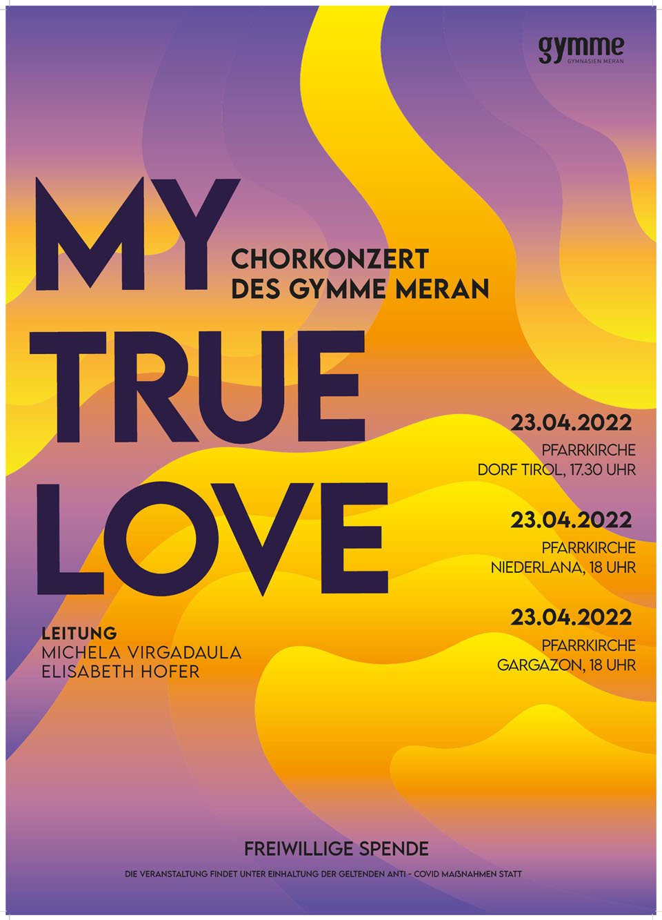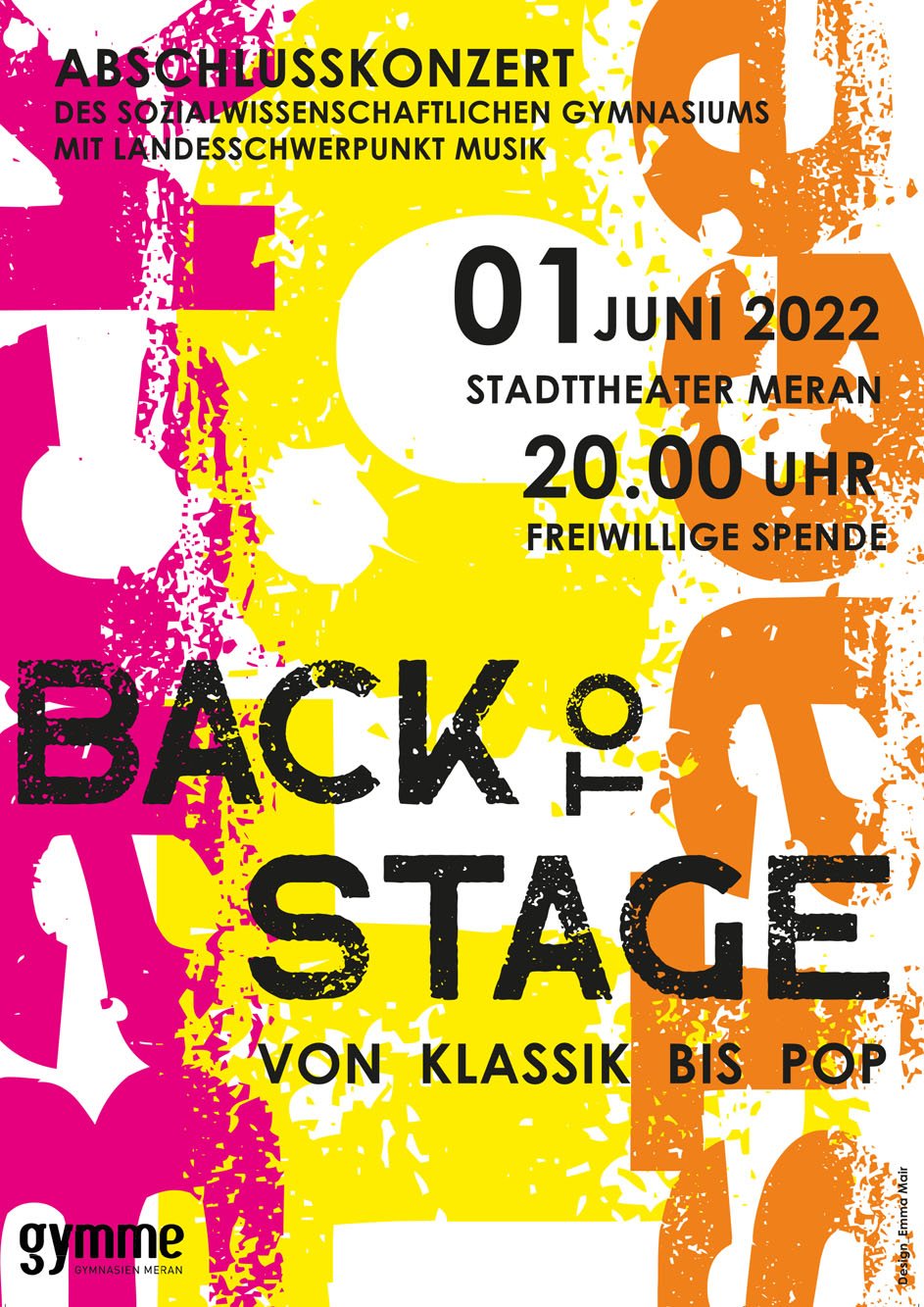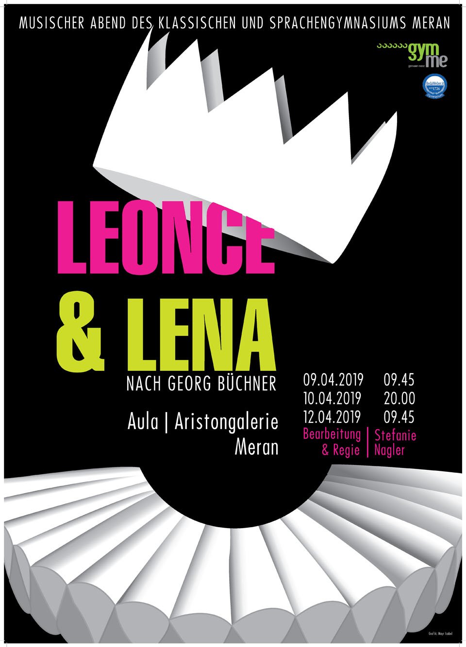 Die Fächer Grafik Werkstatt und Grafik Fachtheorie erarbeiten für die verschiedenen Schulstellen der Gymnasien Meran grafischen Unterlagen wie z.B. Plakate, Flyer und Einladungskarten. Für verschiedene Veranstaltungen wie z.B. Konzerte, Theateraufführungen, Maturabälle usw. werden innerhalb des jeweiligen Fachs Schülerwettbewerbe veranstaltet um verschiedene Ideen und Konzepte zu den jeweiligen Veranstaltungen grafisch zu gestalten.