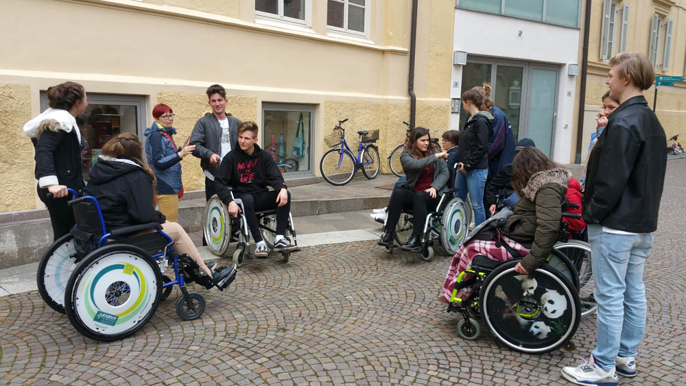 Am 3. April 2019 konnte die Klasse 5B des Sozialwissenschaftlichen Gymnasiums zwei Stunden am Nachmittag das Leben in einem Rollstuhl ausprobieren. Die Klasse wurde dabei von der ehemaligen Schülerin Tamara Berti, welche selbst Rollstuhlfahrerin ist, und der Mitarbeiterin für Inklusion Monika Kind unterstützt.