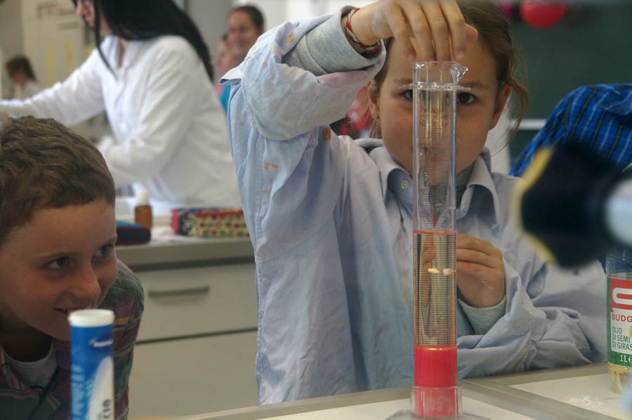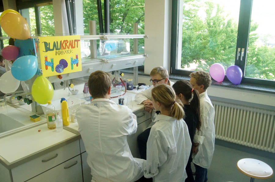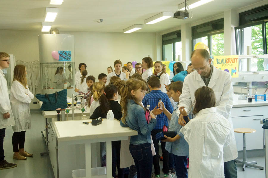 Am Dienstag, den 09. Mai 2017, führten wir, die Klasse 3E, das Projekt „Faszination Chemie“ durch. Nach langer Vorbereitung im Füla Unterricht mit Herrn Professor Dejori, Frau Professor Trenker und Frau Professor Winkler war es endlich soweit! Wir durften den Schülern der Klasse 3B der Grundschule Franz Tappeiner Experimente zeigen und ihnen das Fach Chemie ein Bisschen näherbringen. Es gab sieben Stationen, an denen sie Versuche wie Lavalampe, Falschmünzerei oder Blaukrautindikator miterleben konnten. Die Kinder durften bei den Experimenten mitarbeiten und bekamen auch eine Projektmappe mit Arbeitsblättern zu den einzelnen Versuchen, die sie zusammen mit uns ausfüllten.
