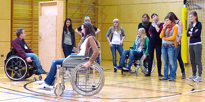 Am 20.04.2012 fand in unserer Sporthalle, organisiert von der Arbeitsgruppe Inklusion, unter Leitung von Herrn Roland Reiterer ein Rollstuhltag statt. Schüler/innen des Sozialwissenschaftlichen, Klassischen, Sprachen- und Kunstgymnasiums Meran konnten durch umfangreiche theoretische Informationen und durch praktisches Üben (Rollstuhlparcour, Handhabung von Rollstühlen, Ein- und Aussteigen aus dem Auto, Informationen zum Versehrtensport) für Menschen mit Beeinträchtigung und für architektonische Barrieren sensibilisiert werden.