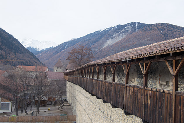Wir haben uns um 8.00 Uhr am Meraner Bahnhof getroffen und sind mit dem Zug nach Mals gefahren. Dort trafen wir uns mit unseren Mitschülerinnen und den Gastschülern aus dem Oberen Vinschgau und gingen zu Fuß nach Glurns. Eingepackt in dicke Jacken und Schals freuten wir uns über die Sonnenstrahlen und das wunderbare Panorama. Zwei Stadtführer führten uns in getrennten Gruppen durch das Städtchen. Thematisch ging es wieder um die Stadtentwicklung im Mittelalter. Erneut begegnete uns Meinhard II, der Glurns aus seiner Bedeutungslosigkeit holte und zu einem Handelsmittelpunkt machte, indem er dem Städtchen am St. Bartholomäus-Tag das Marktrecht verlieh. Zudem brachte der Handel mit Salz, das in Hall gewonnen wurde, ein reges wirtschaftliches Wachstum. Das Salz durfte nur in Glurns gewogen werden und Fuhrleute brachten es in die Lombardei.