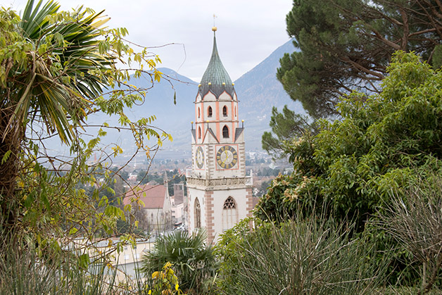Am dritten Tag konnten einige aus unserer Klasse etwas länger schlafen, um 10.00 Uhr trafen wir uns alle zusammen auf dem Thermenplatz mit dem ORF-Journalisten und Stadtführer Patrick Rina, der kürzlich zusammen mit anderen Autoren ein Buch über den Meraner Kurarzt Dr. Franz Tappeiner herausgegeben hat. Wir teilten uns wieder in zwei Gruppen. Während die einen die Stadtführung machten, spazierten die anderen über die Wandelhalle und über die Sommerpromenade in die Gilf und von dort zum Pulverturm und über den Tappeinerweg wieder zurück in das Stadtzentrum. Überwältigt vom Ausblick auf die Stadt haben wir auf dem Pulverturm und auf dem Tappeinerweg viele Fotos geschossen.