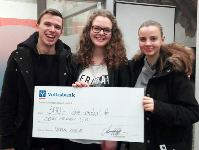 Am Mittwoch, den 22.03.2017 hat zum wiederholten Mal die Geo Challenge in der Volksbank Meran stattgefunden. Drei Schülerinnen und Schüler der Klasse 5A/so waren wieder erfolgreich. Zu dritt mussten sie eine Stadt, eine Sehenswürdigkeit und die Flagge eines Landes erkennen und einem Land zuordnen und danach auf einer Weltkarte markieren. Wenn der eigentliche Ort den gesetzten Punkt nicht berührte, wurde der Abstand zwischen den beiden Punkten abgemessen. Ziel war es, am wenigsten cm Abstand aus der Summe aller drei Kategorien zu erreichen. Anne Ferstl, Pia Kofler und Thomas Sanin haben bereits in den vergangenen vier Jahren an der Geo Challange teilgenommen und sowohl in der zweiten als auch in der dritten Klasse gewonnen. In der vierten Klasse war es ein knappes Rennen, wobei sie um mickrige 5mm verloren hatten. Heuer haben sie es nun wieder – zum letzten Mal – geschafft und 300 € für die Klassenkasse gewonnen!