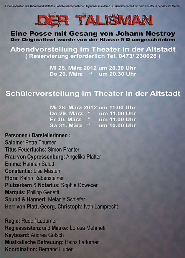 Das Sozialwissenschaftliche Gymnasium Meran präsentiert heuer bereits zum 16. Mal in Zusammenarbeit mit Rudi Ladurner und seinem Theater in der Altstadt ein Schülerstück, das in enger Zusammenarbeit zwischen Schülern, Regisseur und Koordinator Bertrand Huber in der schulinternen Theaterwerkstatt entstanden ist.