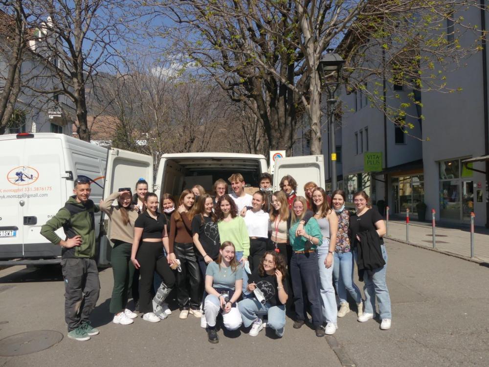 Am Freitag, 25.03.22 wurden 98 Kartone mit Sachspenden Herrn Besay Mayer, Vertreter des Jugendzentrums Jungle, übergeben. Die Sachspenden werden an den VKE (Verein für Kinderspielplätze) weitergeleitet, in Bozen sortiert und dann direkt in die Ukraine geschickt. Der voll bepackte Lieferwagen des Jugendzentrums zeugte von der großen Spendenbereitschaft des „gymme Meran“.