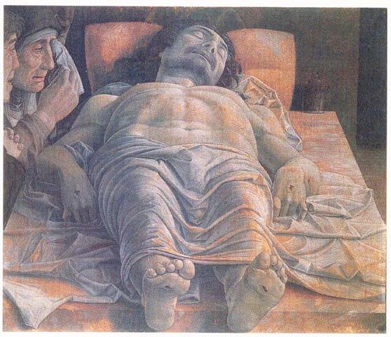 Andrea Mantegna ging es in seinem Tafelbild „Der tote Christus“ um 1480 (Brera, Mi) um das Aufzeigen seiner virtuosen Beherrschung einer extremen Perspektive der menschlichen Gestalt. So stark verkürzt zeigte sich noch nie eine Gestalt – Grund genug für zig zeitgenössische Künstler sich an diesem Vorbild zu messen. (KÖRPERILLUSION)