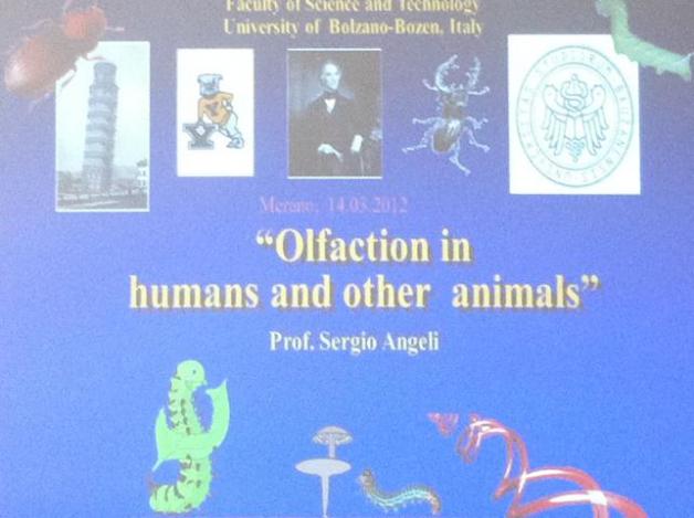 Mit Hilfe anschaulicher Beispiele vermittelte Prof. Angeli einen hochinteressanten Einblick in die Welt des Geruchssinns. Neben dem Menschen kamen dabei auch Insekten und Elefanten zur Sprache. Highlight war das Riechen an einem Sexualhormon. Die Schüler/innen zeigten sich begeistert und diskutierten angeregt in exzellentem Englisch mit dem Gast der Universität Bozen.