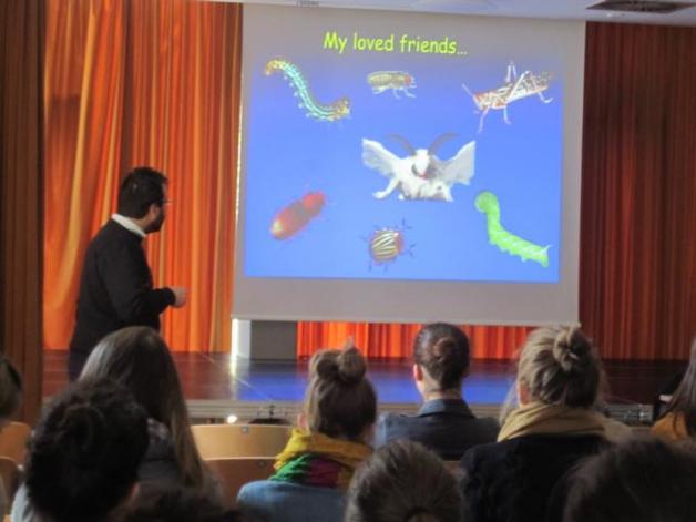 Er weckte bei den Schüler/innen der 3. Klassen das Interesse für das Thema „Geruchssinn“, indem er den Bogen vom Menschen zu Insekten und Affen spannte und schließlich auch noch den Einfluss des Geruchs auf die Partnerwahl thematisierte.