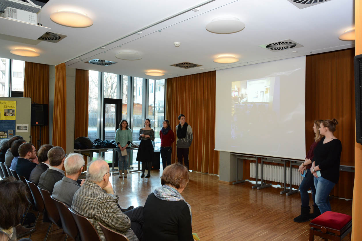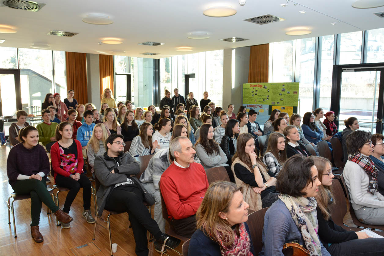 Irene Terzer, Initiatorin und Koordinatorin der „Schulbrücken“-Mitgliedschaft des Gymnasiums „Beda Weber“ ging kurz auf die Wichtigkeit solcher interkultureller und europäischer Projekte ein, bevor Schülerinnen und Schüler die „Schulbrücken“ vorstellten und von ihren Erfahrungen berichteten, wobei die Begeisterung aller Beteiligten klar zum Ausdruck kam. Um es mit den Worten einer Schülerin zu sagen: „Wenn man von der Schulbrücke zurückkehrt, ist man irgendwie verändert im Kopf. Wer einmal dabei war, will immer dabei sein.“