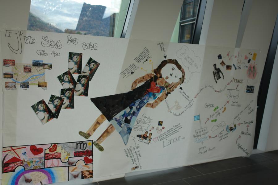 Als Vorbereitung auf die Begegnung mit dem französischen Autor Gilles Abier haben die Französischlerner der Klasse 3B des Sprachengymnasiums "Beda Weber" den Roman "J'me sens pas belle" gelesen und anschließend eine visuelle Zusammenfassung des Romans erarbeitet und präsentiert. Das Plakat in Übergröße ist seit ein paar Tagen im 2. Stock zu sehen. Der Autor zeigte sich bei seinem Besuch an der Schule begeistert von der Arbeit.