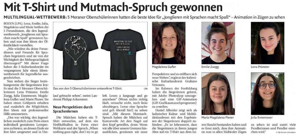Für die Siegerinnen gab es einen Geldpreis von 500€ pro Person und die Möglichkeit im Herbst eine mehrtägige Online-Fortbildung zu besuchen, in welcher sie u.a. die Grundlagen von Photoshop erlernten. Mit einer Grafikerin haben sie ihre Idee auf andere Produkte übertragen. Entstanden sind dabei tolle T-Shirts, die bei Initiativen der #multilingual Sprachkampagne verteilt werden, sowie ein animiertes GIF (Graphics Interchange Format). Das Video „Jonglieren mit Sprachen macht Spaß“, das sie erstellt haben, wird 2021 in allen Südtiroler Zügen zu sehen sein (http://www.provinz.bz.it/bildung-sprache/sprachen/initiativen-multilingu...).