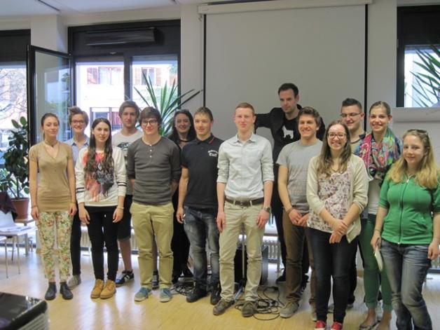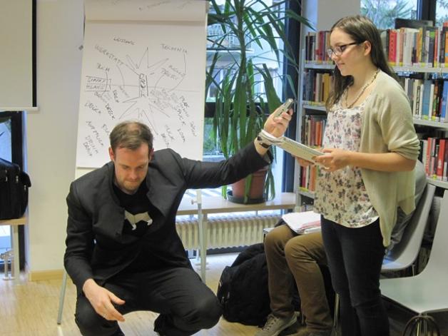 In den drei Stunden, die sehr abwechslungsreich gestaltet waren, bekamen die Schülerinnen und Schüler immer wieder Kostproben des künstlerischen Schaffens von Bas Böttcher zu hören und zu sehen, diskutierten über Merkmale des Poetry Slam und versuchten sich selbst – unter fachkundiger Anleitung und Beratung- im Verfassen und Vortrag von kurzen Poetry Slams. Am Ende der Veranstaltung waren sich alle Beteiligten einig: viel gelernt und viel Spaß und Freude erlebt.