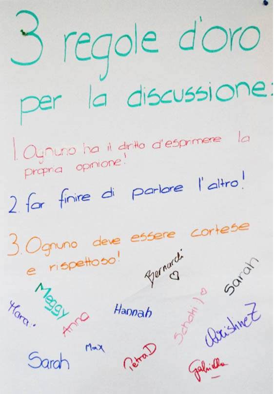 Dopo abbiamo scelto le “tre regole d’oro” per la discussione. Su queste regole abbiamo fatto un cartellone sul quale tutti noi e anche le professoresse hanno messo la loro firma. Lo abbiamo appeso in classe.