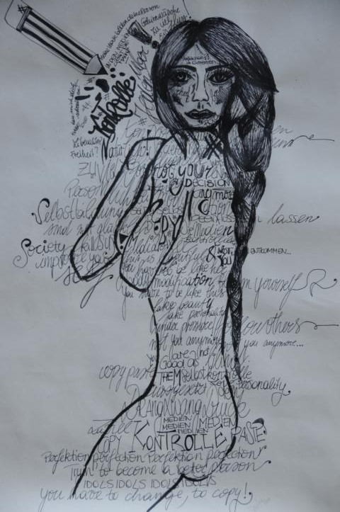 Weitere Werke hinterfragen Religion und Glauben und die damit verbundenen emotionalen Standpunkte hinsichtlich der Meinungsfreiheit. Andere Schüler/innen rufen schon mal nach stärkeren Personenkontrollen an den Grenzen. Vom Thema Krieg ausgehend skizzierte eine Schülerin Waffen jeglicher Art, die Blumen über den ganzen Globus schießen. Da kommt doch einem die Assoziation hoch: „Stell dir vor, es ist Krieg, und keiner geht hin“ (aus dem Gedicht des Amerikaners Carl Sandburg). Tierschutz ist ein weiterer wichtiger Aspekt. Ein humanerer Umgang mit diesen Lebewesen wird moniert.