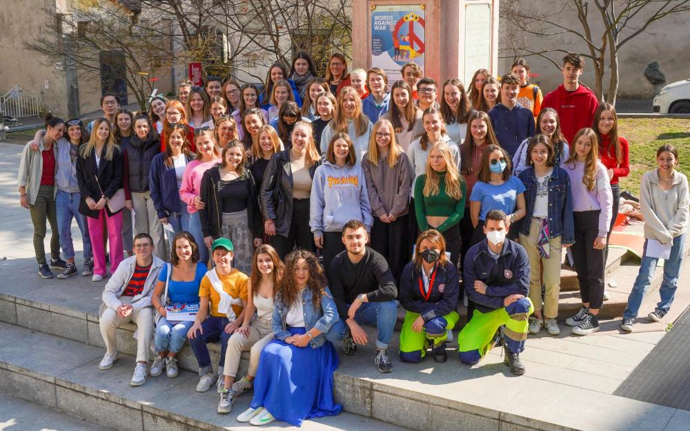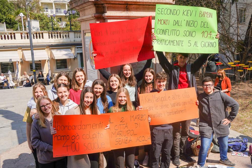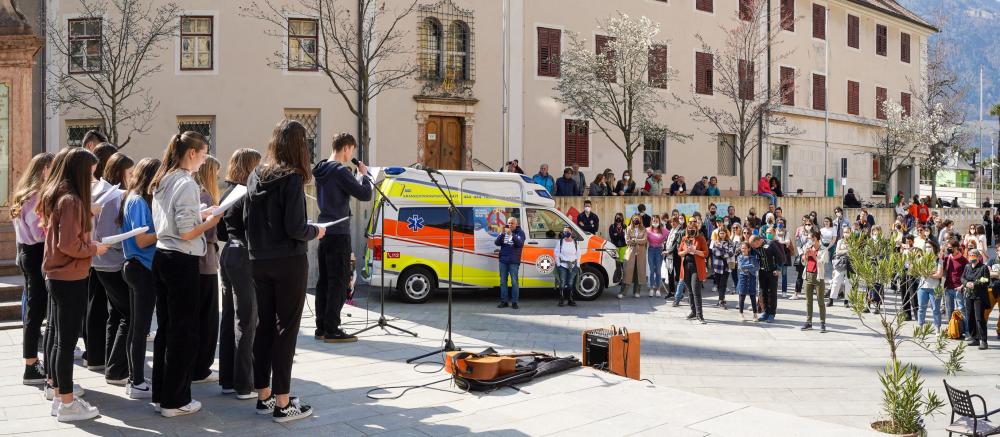 Am 26. März verkündeten Schüler*innen des Klassischen- und Sprachengymnasiums Meran "Beda Weber" am Sandplatz in Meran Botschaften für den Frieden, die Zwischenmenschlichkeit und ein solidarisches Miteinander und sammelten im Anschluss in Zusammenarbeit mit dem Weißen Kreuz Geldspenden für die Ukraine. Die stolze Summe von 1.310 € konnte dem Weißen Kreuz übergeben werden.