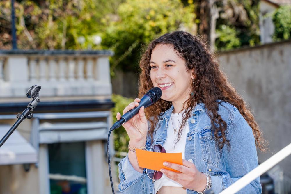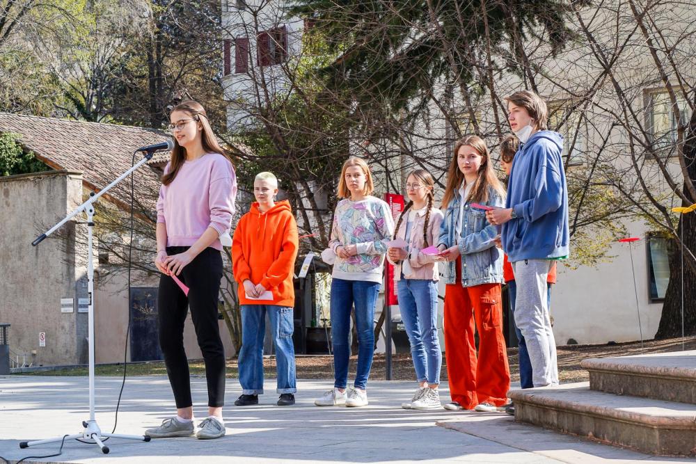 Bei der öffentlichen Veranstaltung wurden Texte, Gedichte, Zitate in vielen verschiedenen Sprachen rezitiert, denn „Frieden gibt es nicht nur in einer Sprache“ – so das Motto der Klasse 5A Sprachengymnasium, die die Aktion organisiert und viele Mitschüler*innen aus anderen Klassen motiviert und mit eingebunden hat.